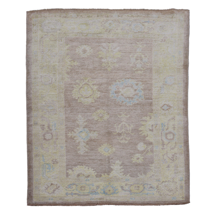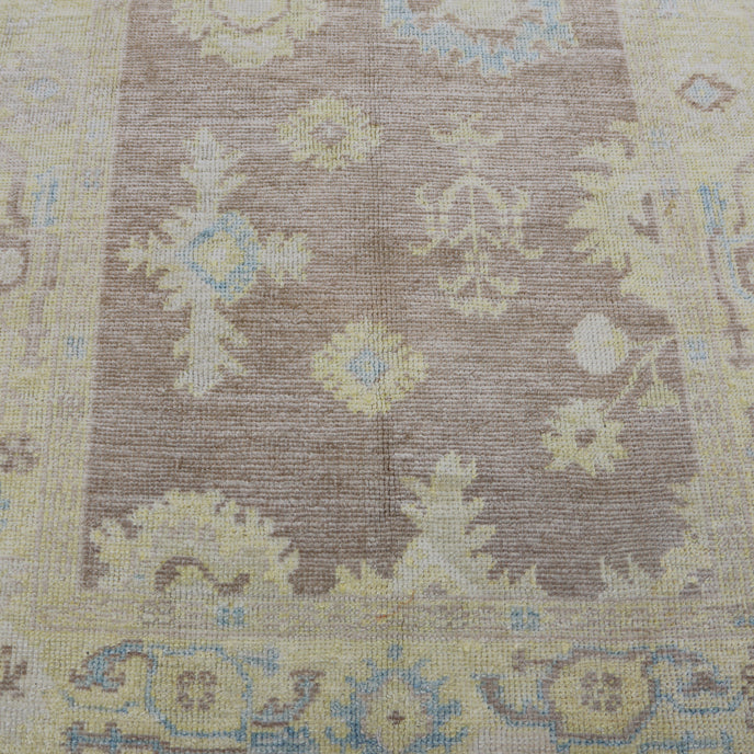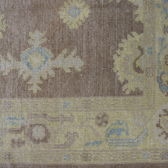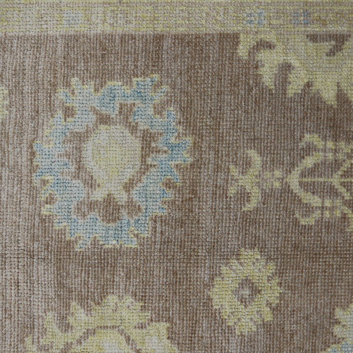 This new Turkish handwoven rug has a beautiful soft brown background with blue and yellow accents. We call this design the "modern oushak" which describes the new take on the classic oushak rug.