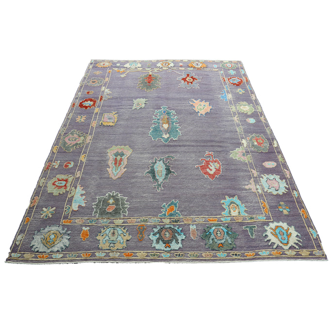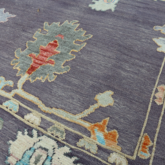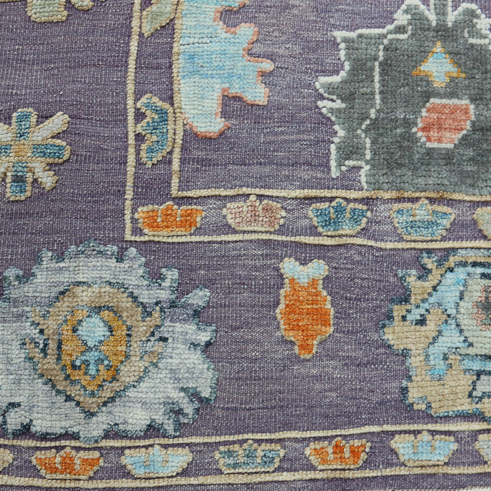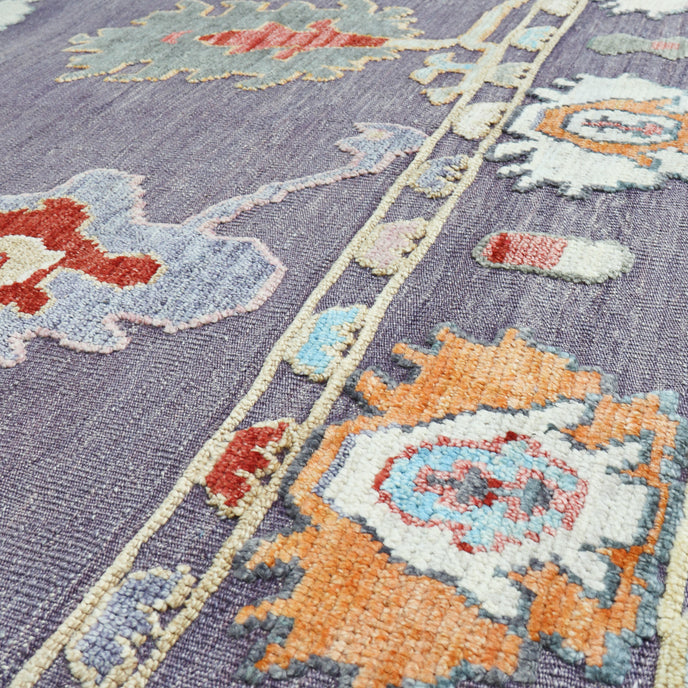 This new Turkish handwoven rug has a beautiful lavender background with multicolored and neutral accents. We call these modern oushaks "high/low" which describes the combination of low and high pile in the design.