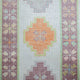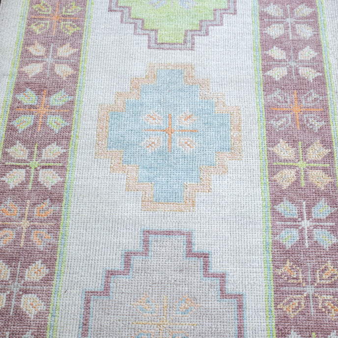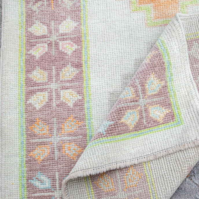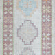 This new Turkish handwoven rug has a beautiful neutral background with purple, green, and other pastel accents. We call this design the "modern oushak" which describes the new take on the classic oushak rug.