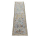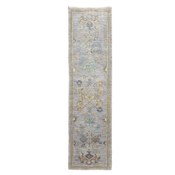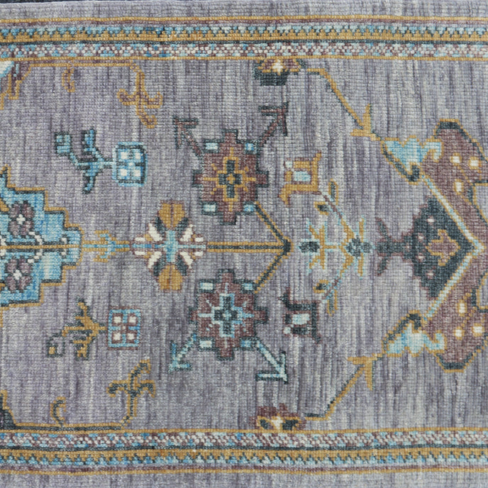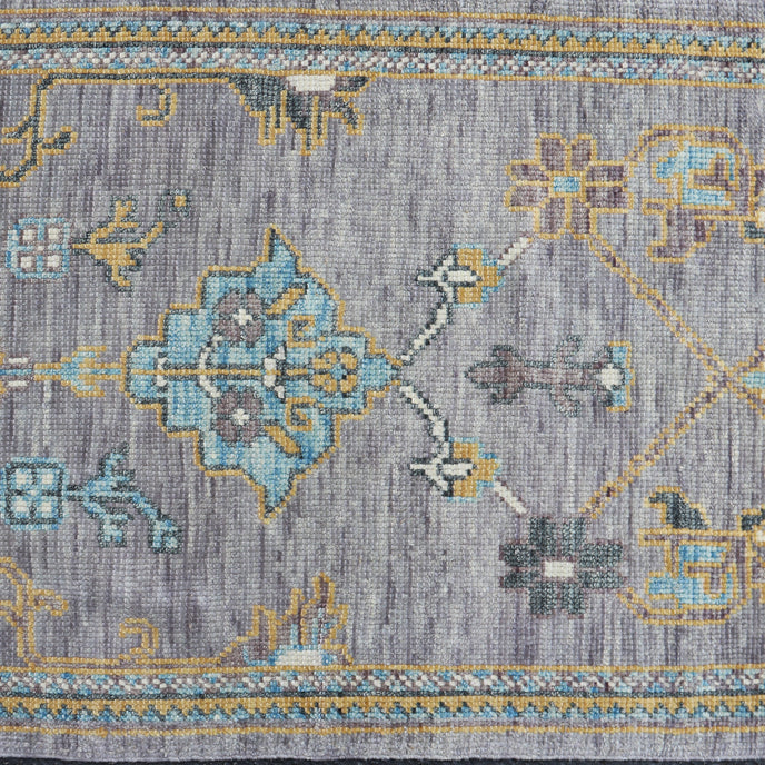 This new Turkish handwoven rug has a beautiful gray background with blue, gold, and neutral accents. Oushak.