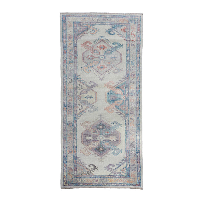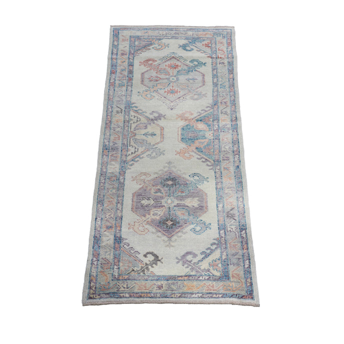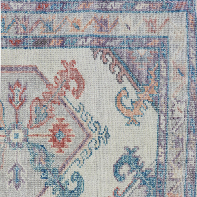 This new Turkish handwoven rug has a beautiful neutral background with lavender, salmon, blue, and gray accents.