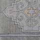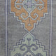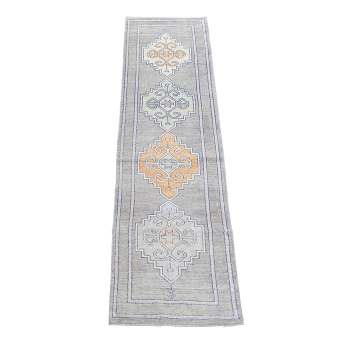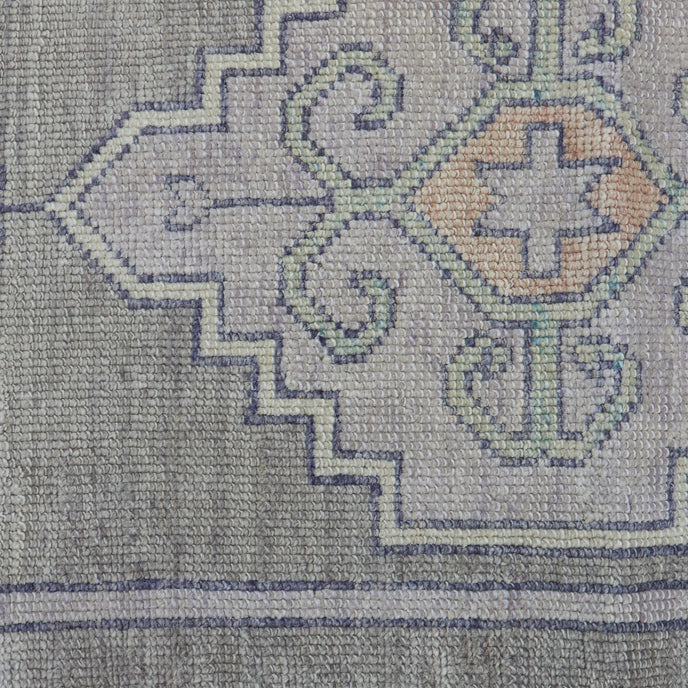 This new Turkish handwoven rug has a beautiful gray background with orange, green, blue, purple, and neutral accents.