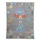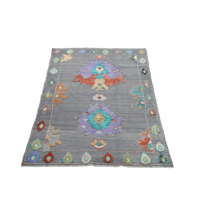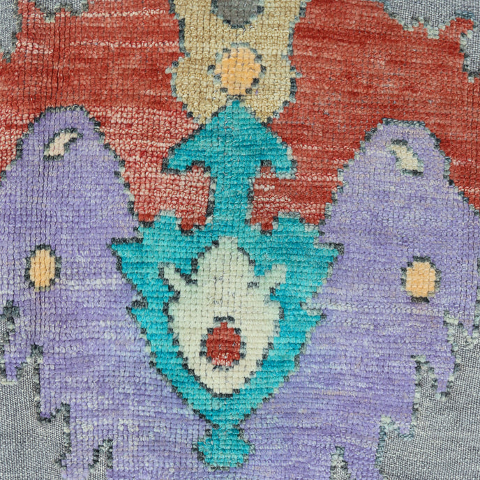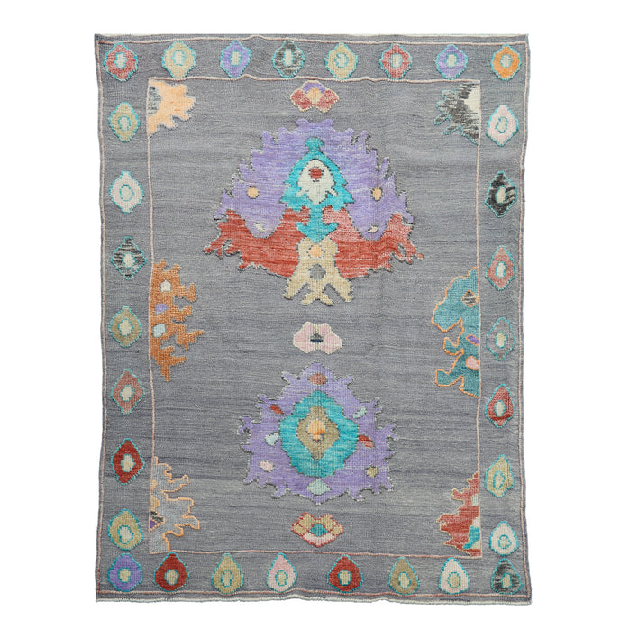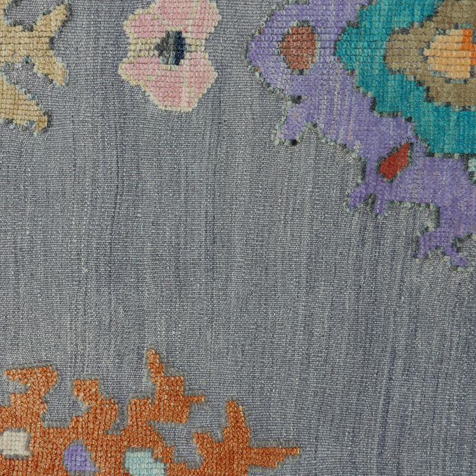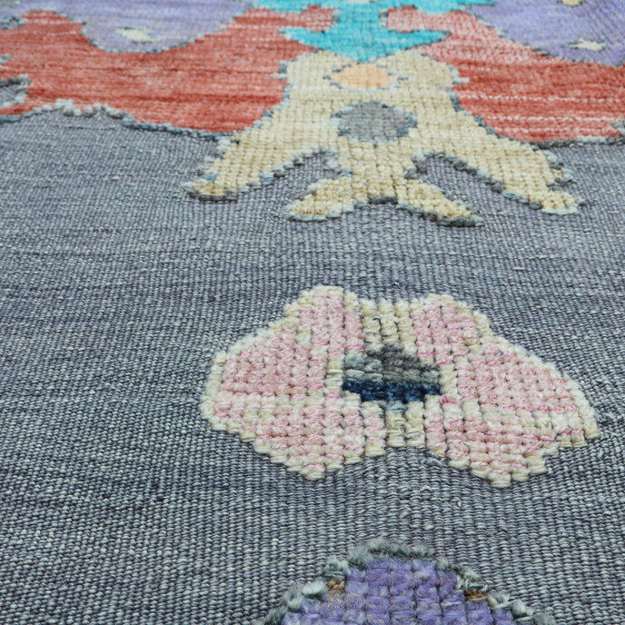 This new Turkish handwoven rug has a beautiful gray background with multicolored accents. We call these modern oushaks "high/low" which describes the combination of low and high pile in the design.