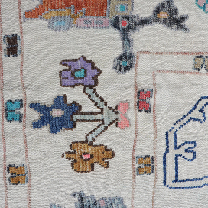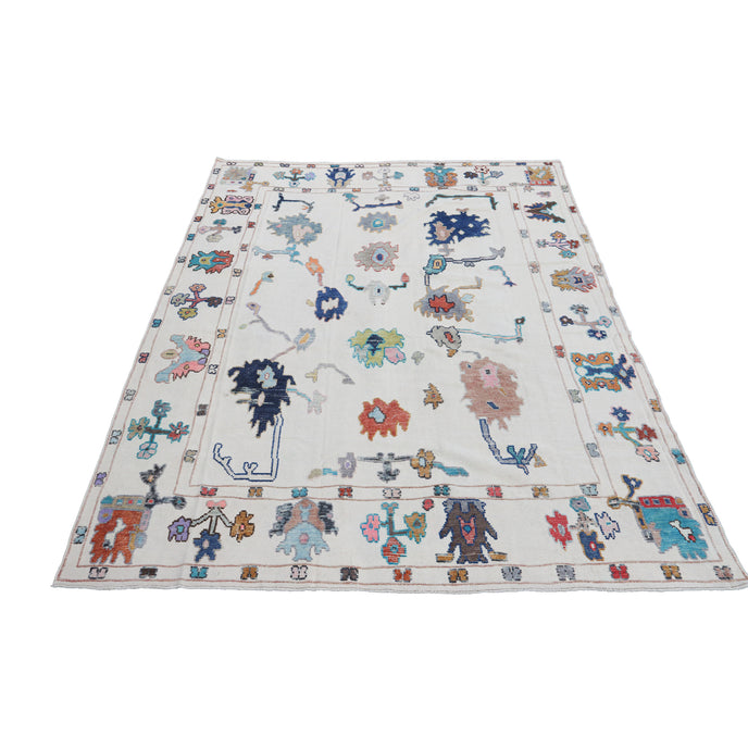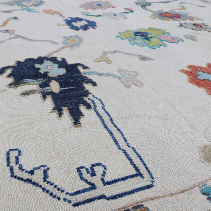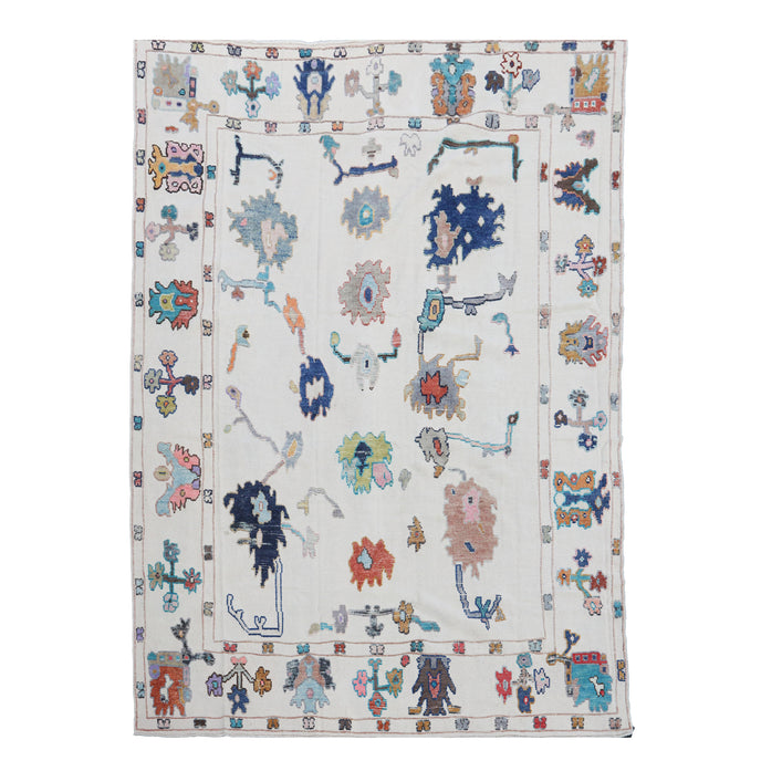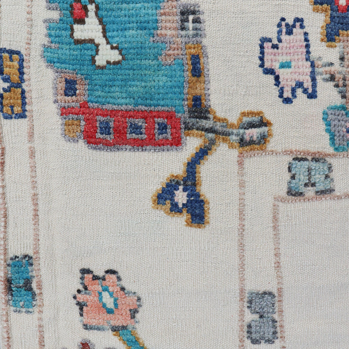 This new Turkish handwoven rug has a beautiful cream colored background with multicolored accents. We call these modern oushaks "high/low" which describes the combination of low and high pile in the design.