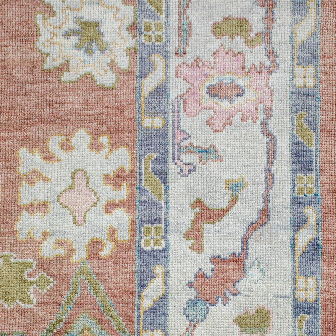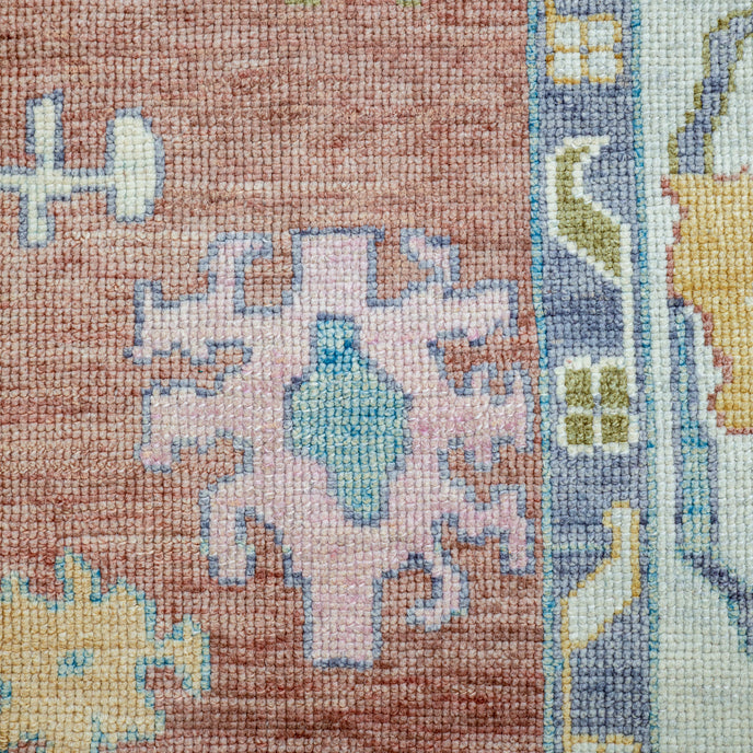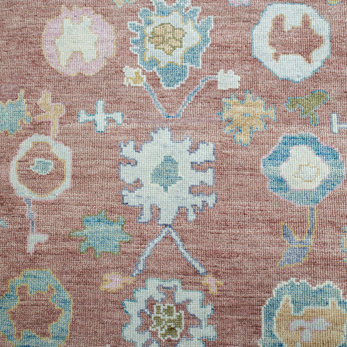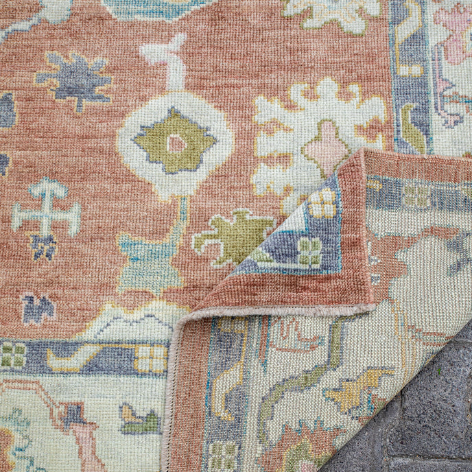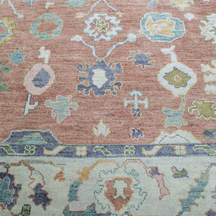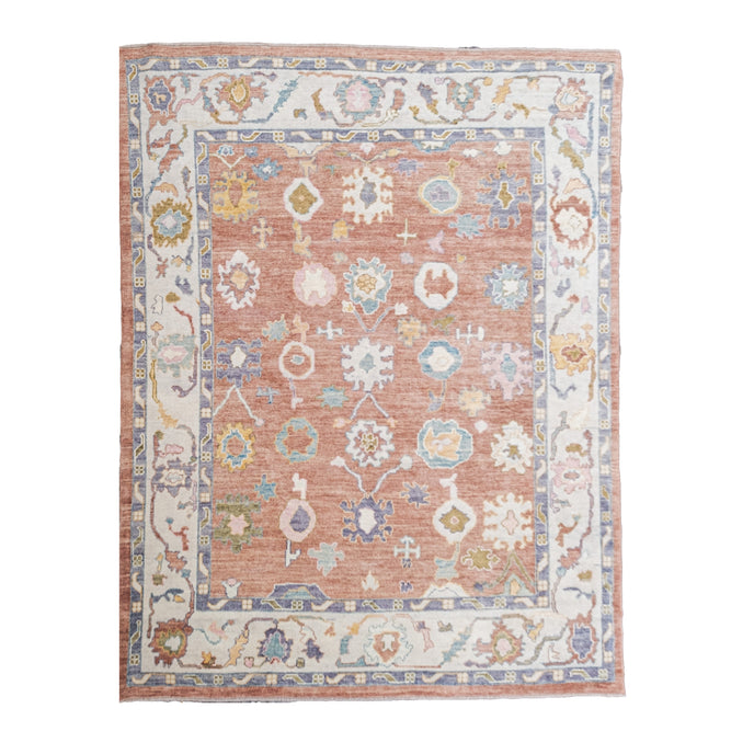 This new Turkish handwoven rug has a beautiful rust background with multicolored and neutral accents. We call this design the "modern oushak" which describes the new take on the classic oushak rug.