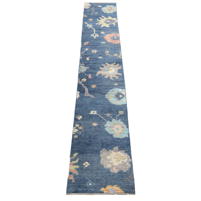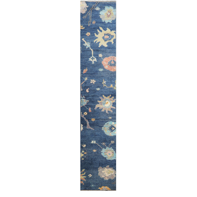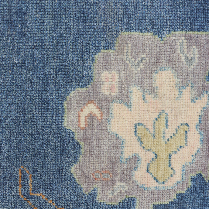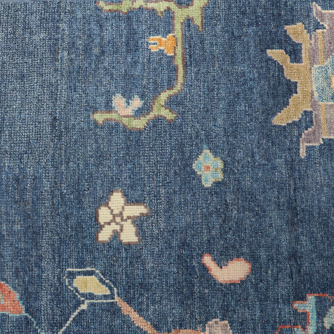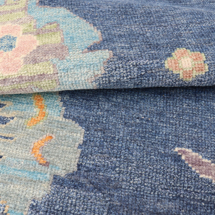This new Turkish handwoven rug has a beautiful blue background with peach, blue, salmon, gold, gray, and neutral accents.