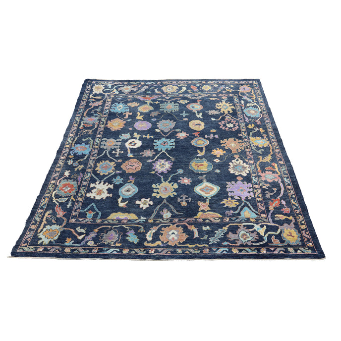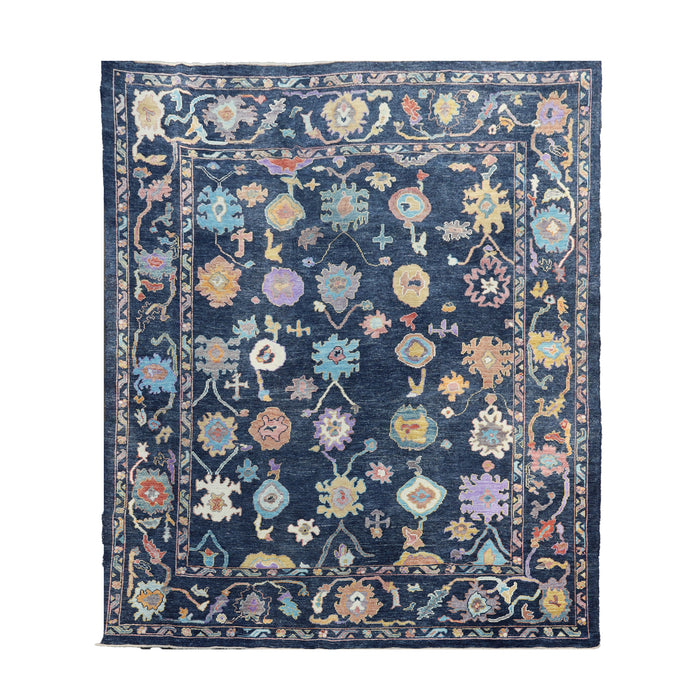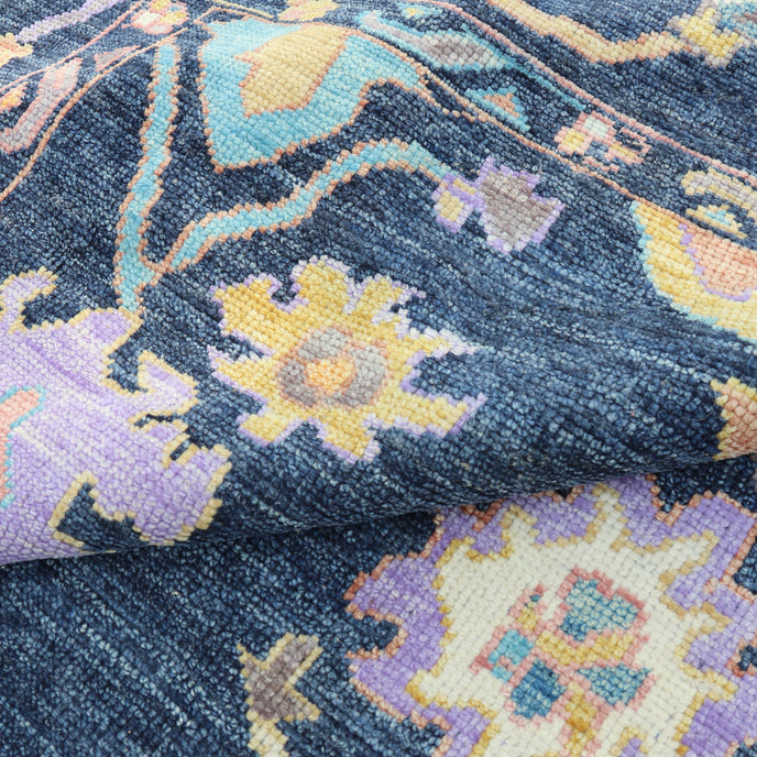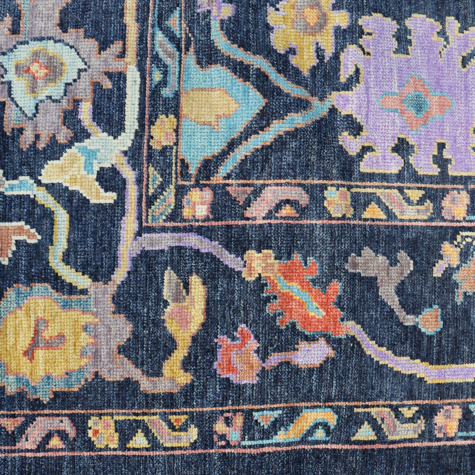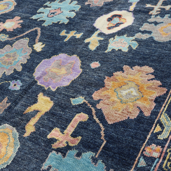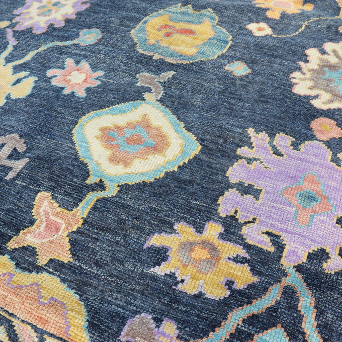 This new Turkish handwoven rug has a beautiful navy background with multicolored and neutral accents. Modern Oushak.