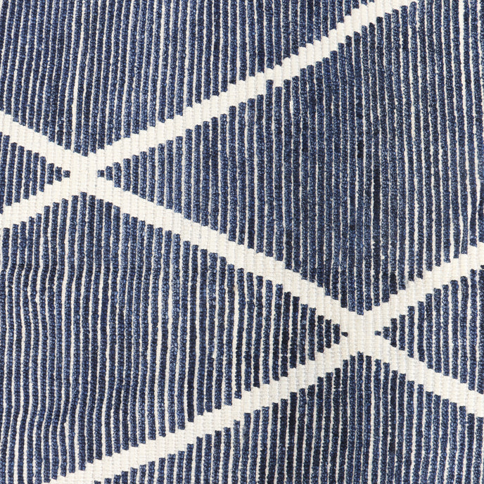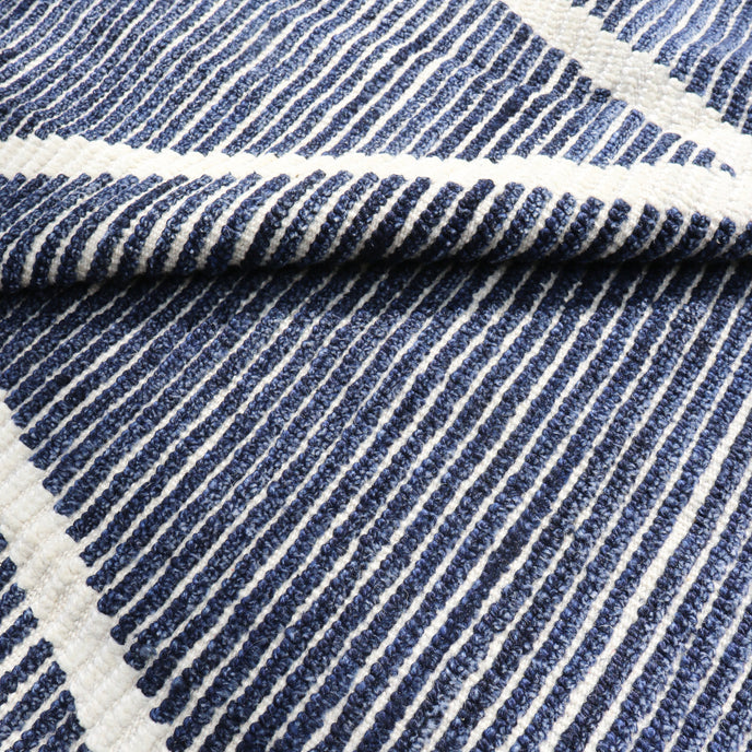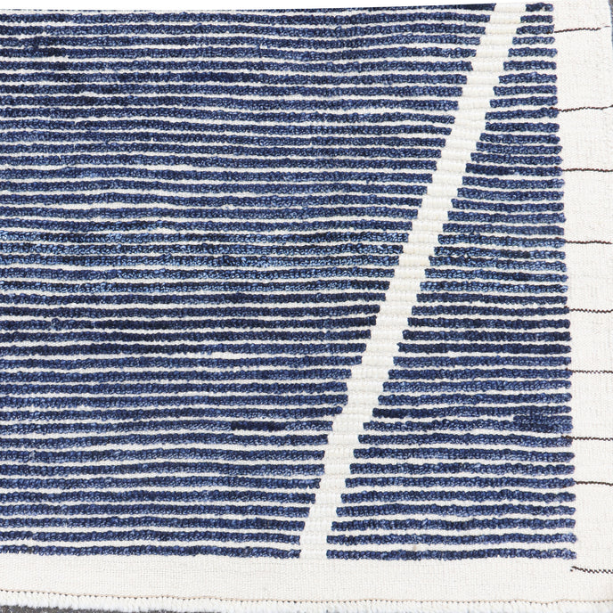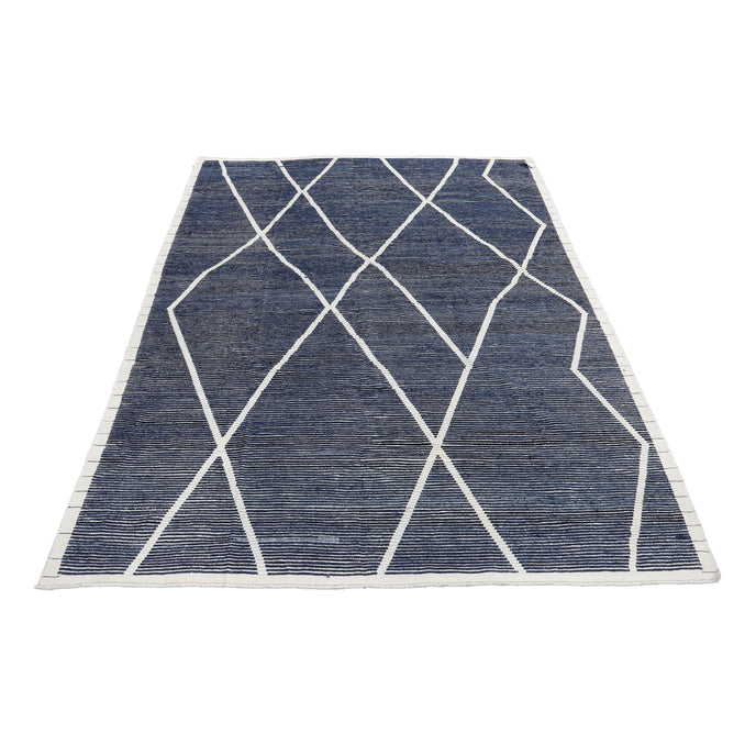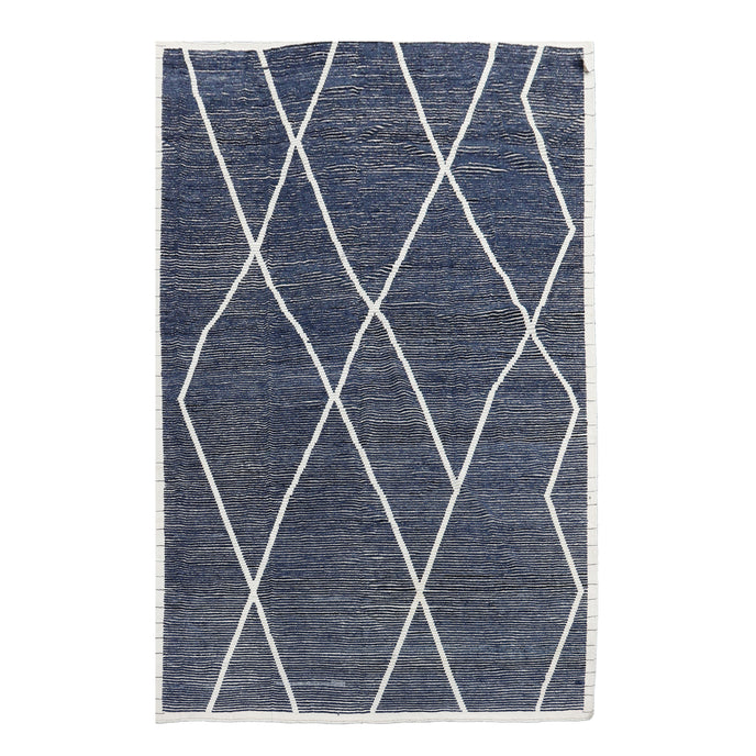 This new Turkish handwoven rug has a beautiful navy background with neutral accents. Modern Tulu.