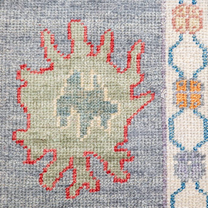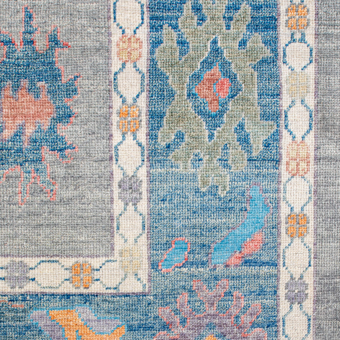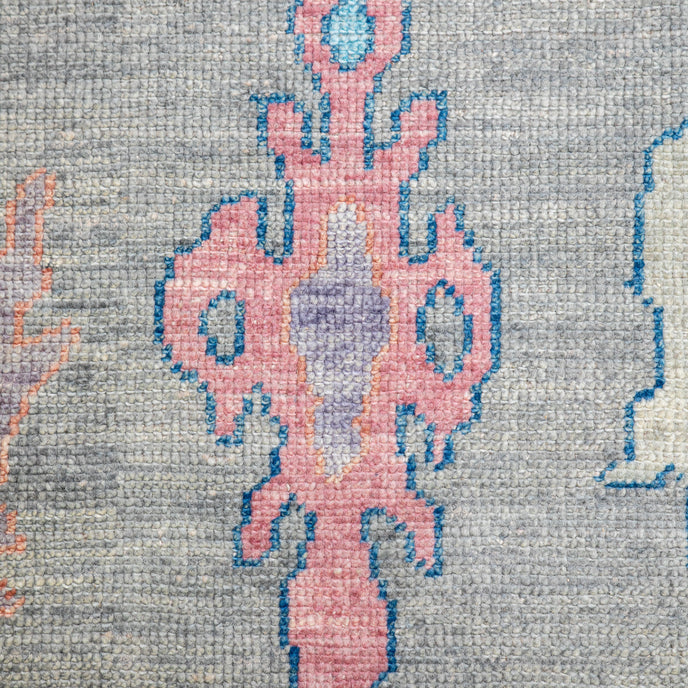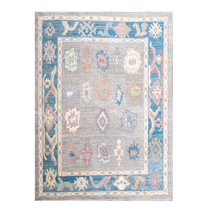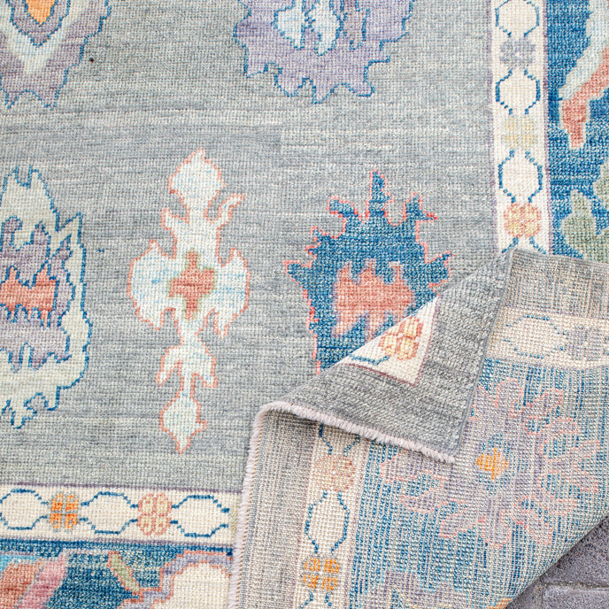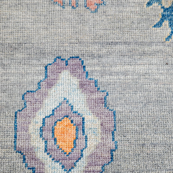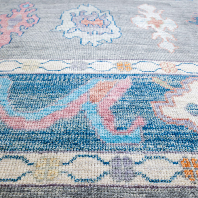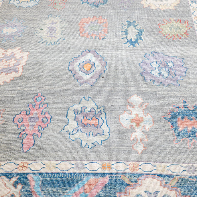 This new Turkish handwoven rug has a beautiful gray background with blue, neutral, and multicolored accents. We call this design the "modern oushak" which describes the new take on the classic oushak rug.