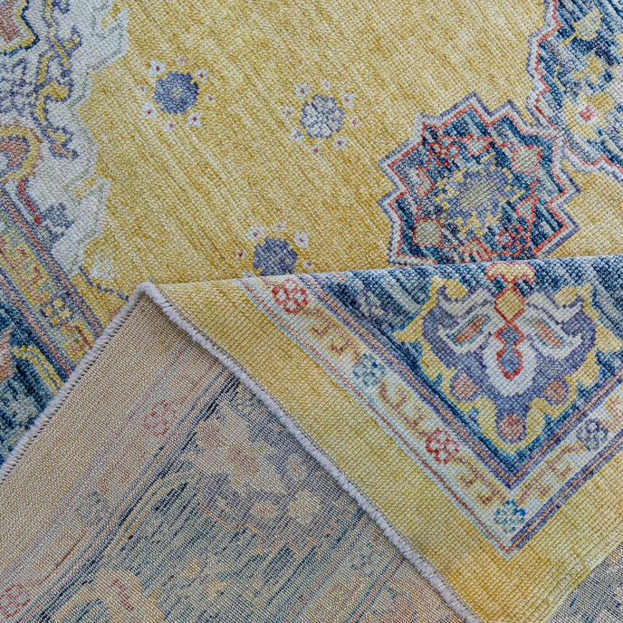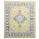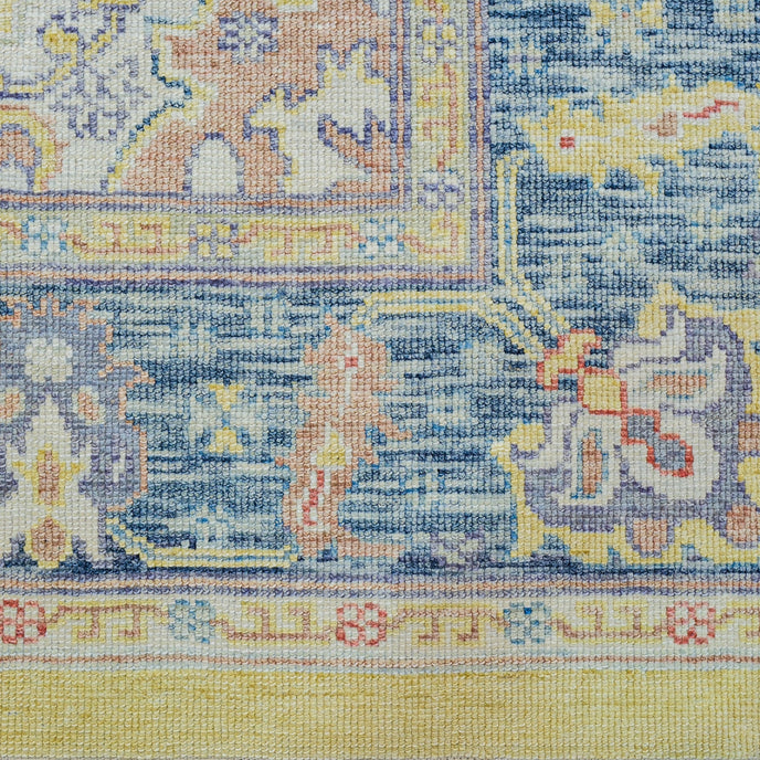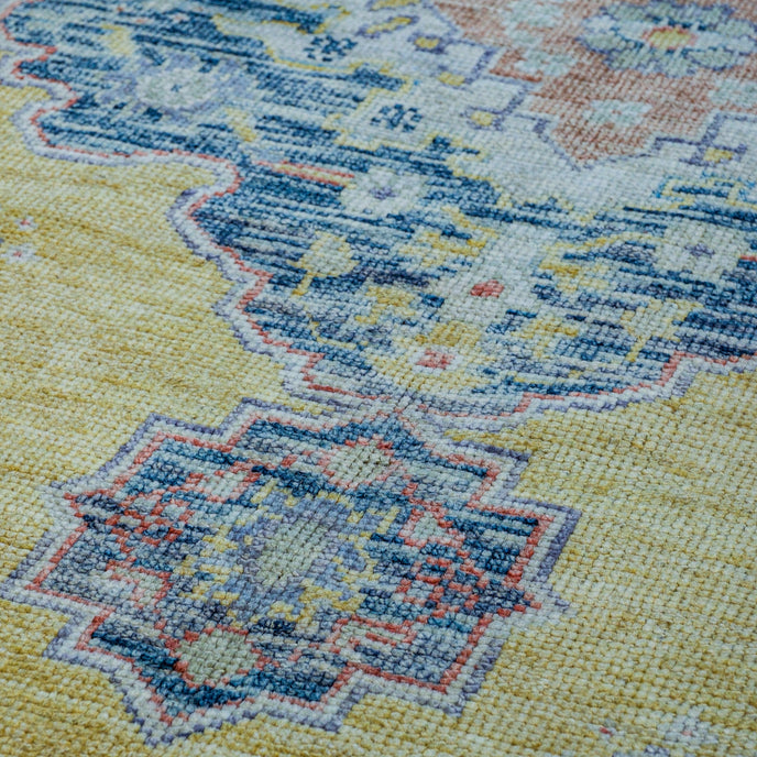 This new Turkish handwoven rug has a beautiful soft gold background with blue, peach, coral, and neutral accents. We call this design the "modern oushak" which describes the new take on the classic oushak rug.