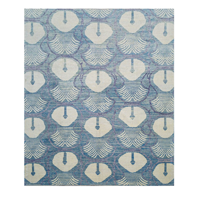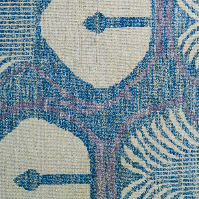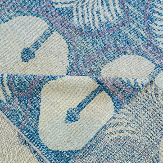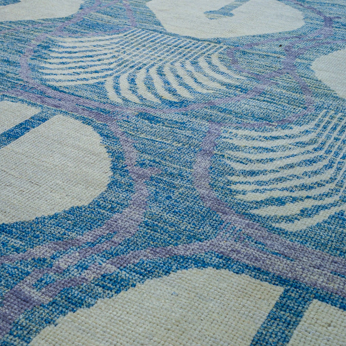 This new Turkish handwoven rug has a beautiful blue background with cream, purple, and neutral accents. We call this design the "modern oushak" which describes the new take on the classic oushak rug.