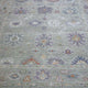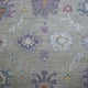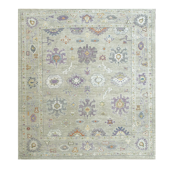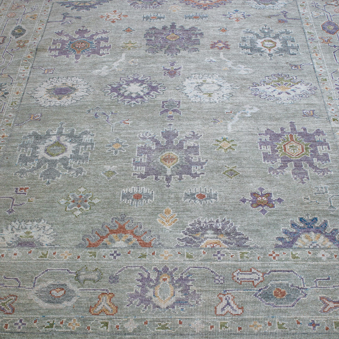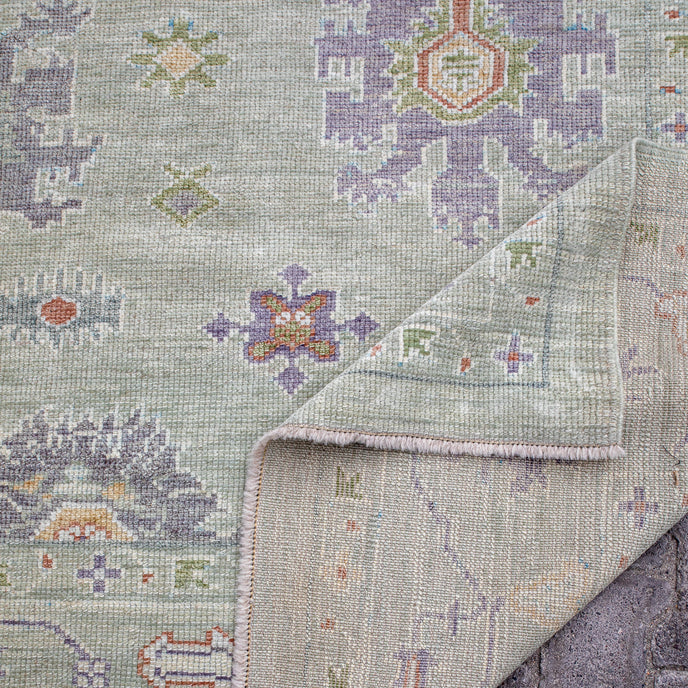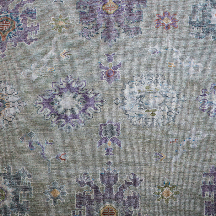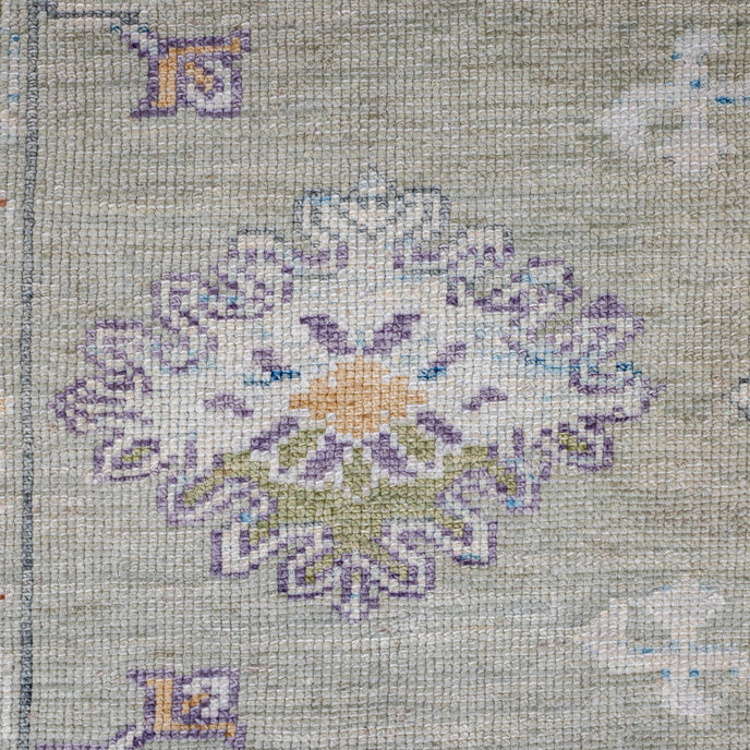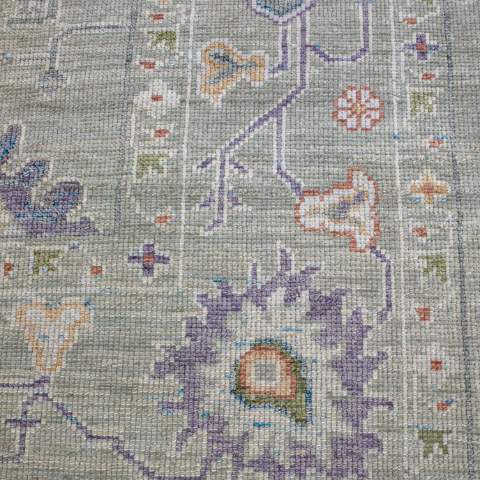 This new Turkish handwoven rug has a beautiful soft green background with purple, neutral, and multicolored accents. We call this design the "modern oushak" which describes the new take on the classic oushak rug.