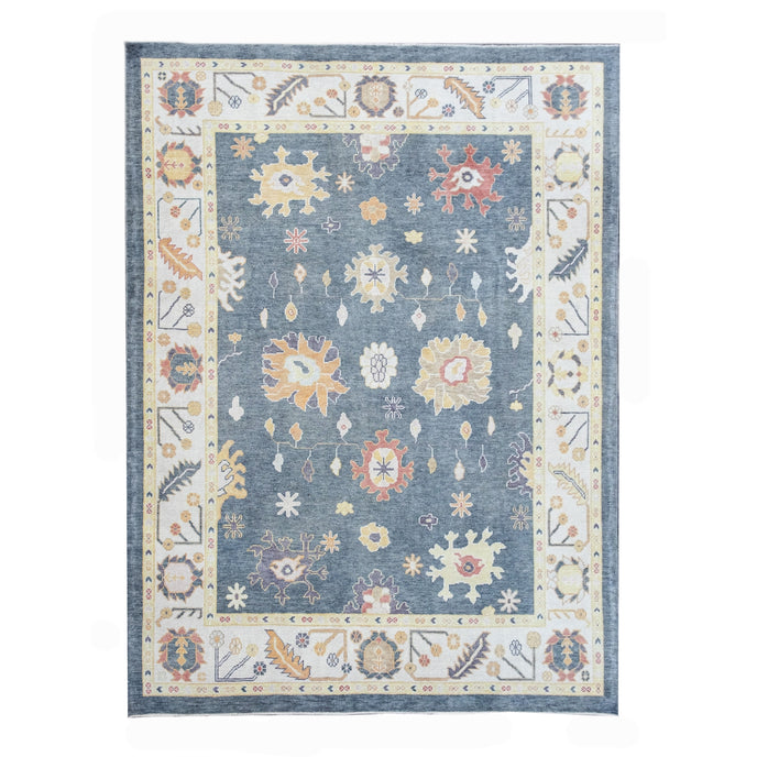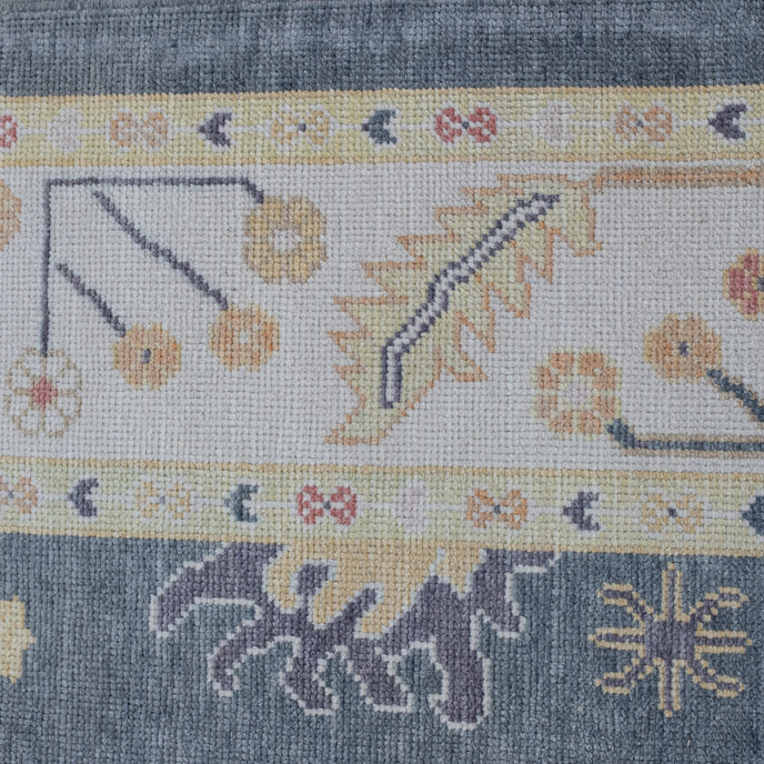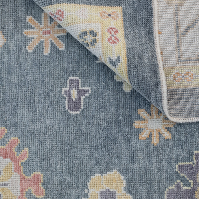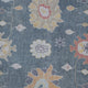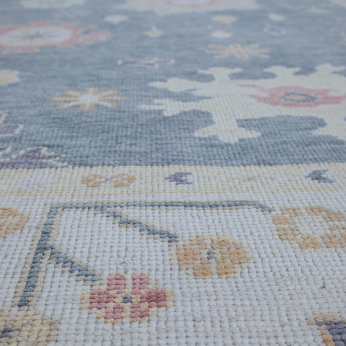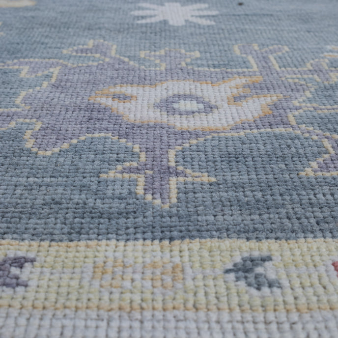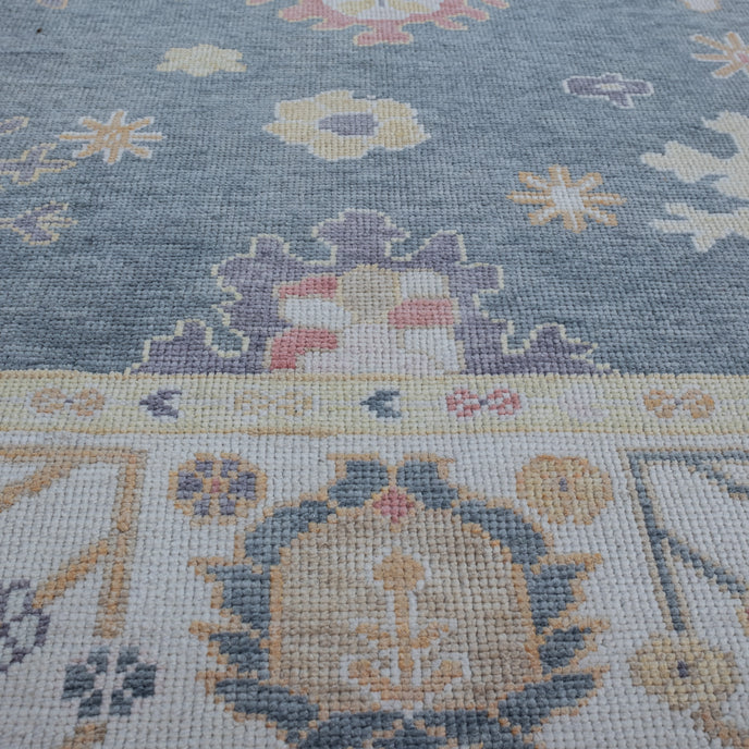 This new Turkish handwoven rug has a beautiful blue gray background with soft multicolored and neutral accents. We call this design the "modern oushak" which describes the new take on the classic oushak rug.