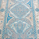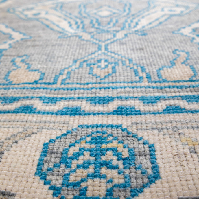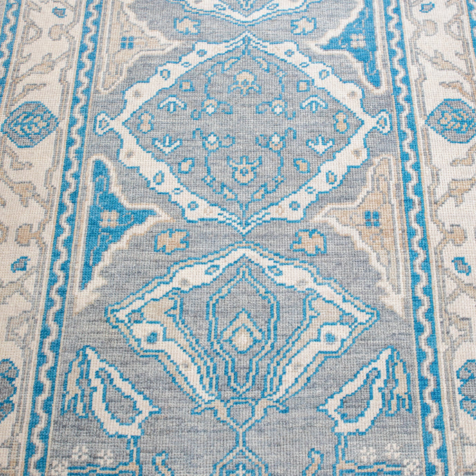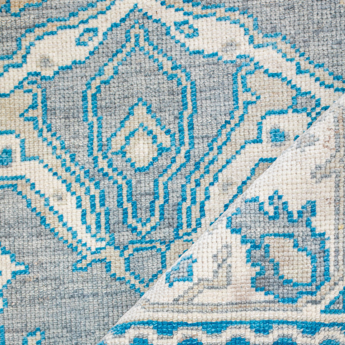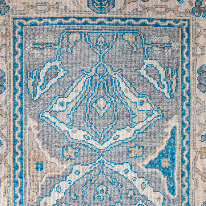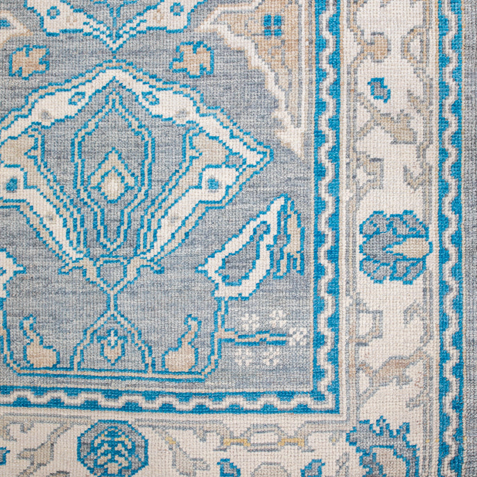 This new Turkish handwoven rug has a beautiful gray background with blue, tan, and other accents. We call this design the "modern oushak" which describes the new take on the classic oushak rug.