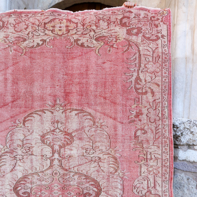 This Turkish handwoven vintage rug has a gorgeous salmon pink background with cream accents. Demerci.