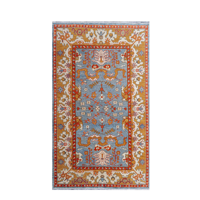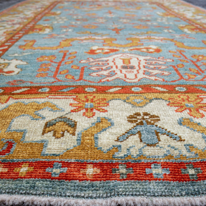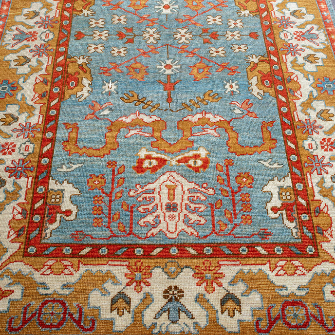 This new Turkish handwoven rug has a beautiful blue background with gold, yellow, rust, and neutral accents. We call this design the "modern oushak" which describes the new take on the classic oushak rug.