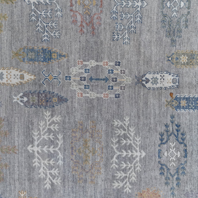 This new Turkish handwoven rug has a beautiful gray background with multicolored accents. We call this design the "modern oushak" which describes the new take on the classic oushak rug.