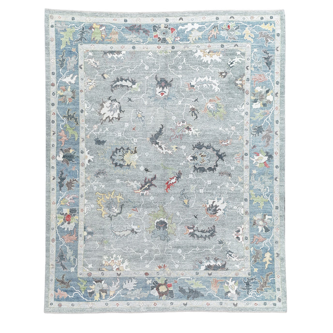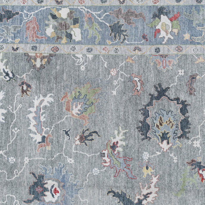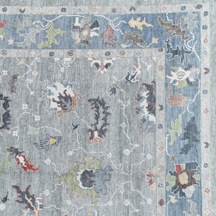 This new Turkish handwoven rug has a beautiful gray background with blue, green, and white accents. We call this design the "modern oushak" which describes the new take on the classic oushak rug.