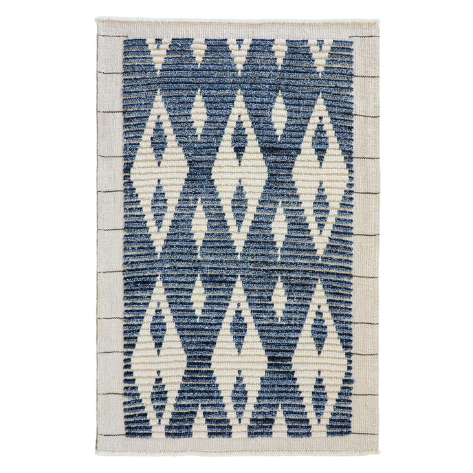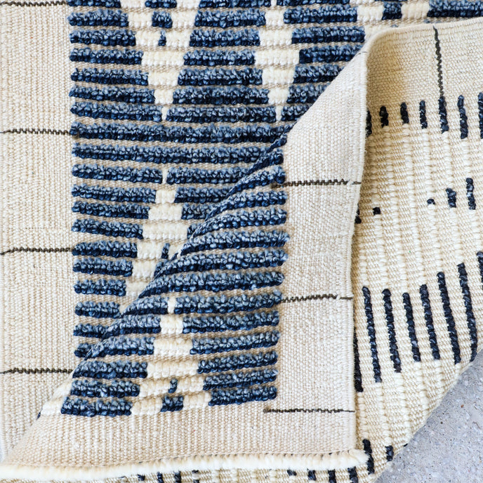 This new Turkish handwoven rug has a beautiful blue background with off white accents. We call this design the "modern tulu" which describes the new take on the classic tulu rug with a thicker pile.