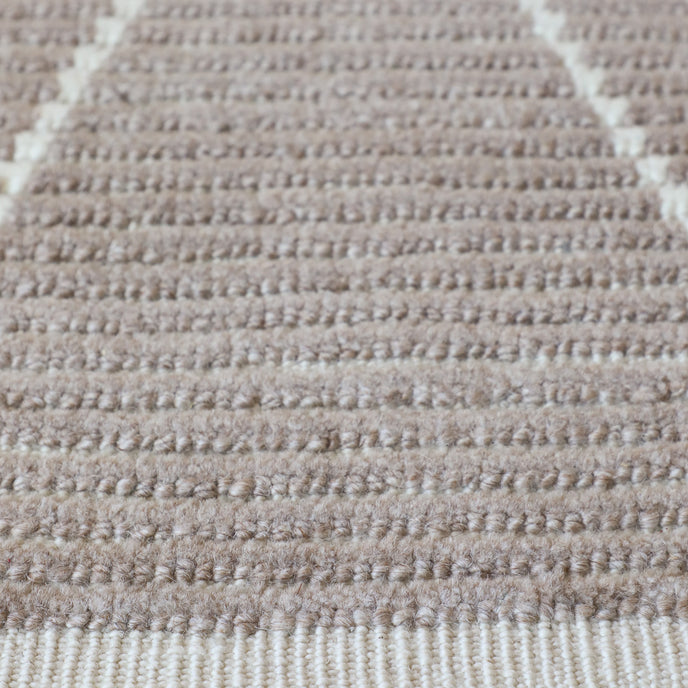 This new Turkish handwoven rug has a beautiful taupe tan background with ivory accents. We call this design the "modern tulu" which describes the new take on the classic tulu rug with a thicker pile.