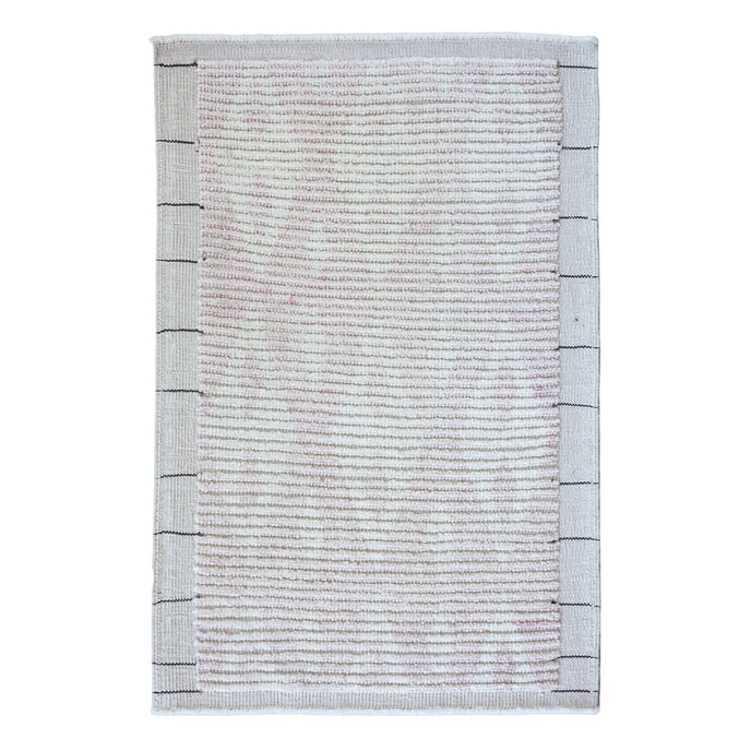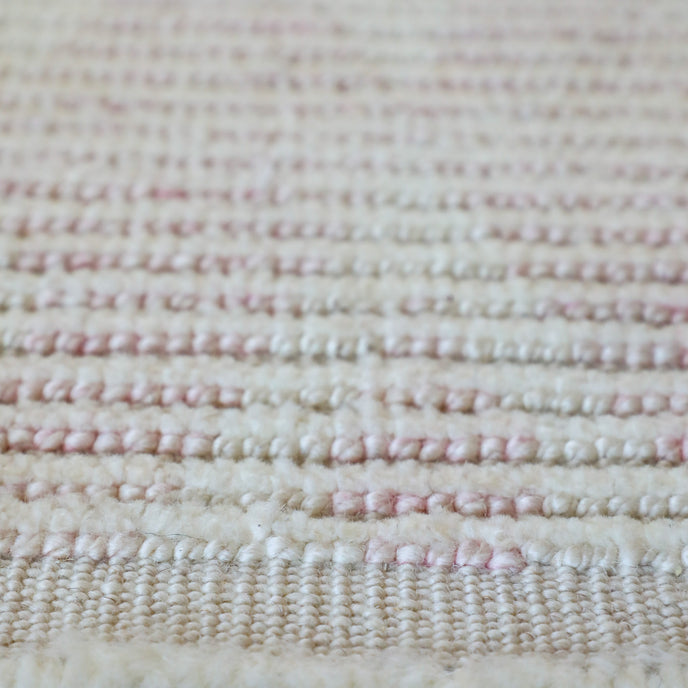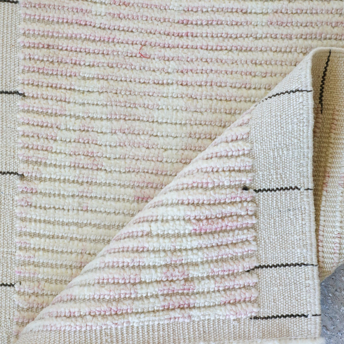 This new Turkish handwoven rug has a beautiful light pink background with neutral accents. We call this design the "modern tulu" which describes the new take on the classic tulu rug with a thicker pile.