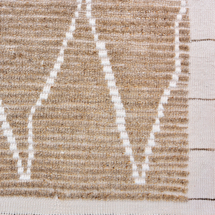 This new Turkish handwoven rug has a beautiful tan background with neutral accents. We call this design the "modern tulu" which describes the new take on the classic tulu rug with a thicker pile.