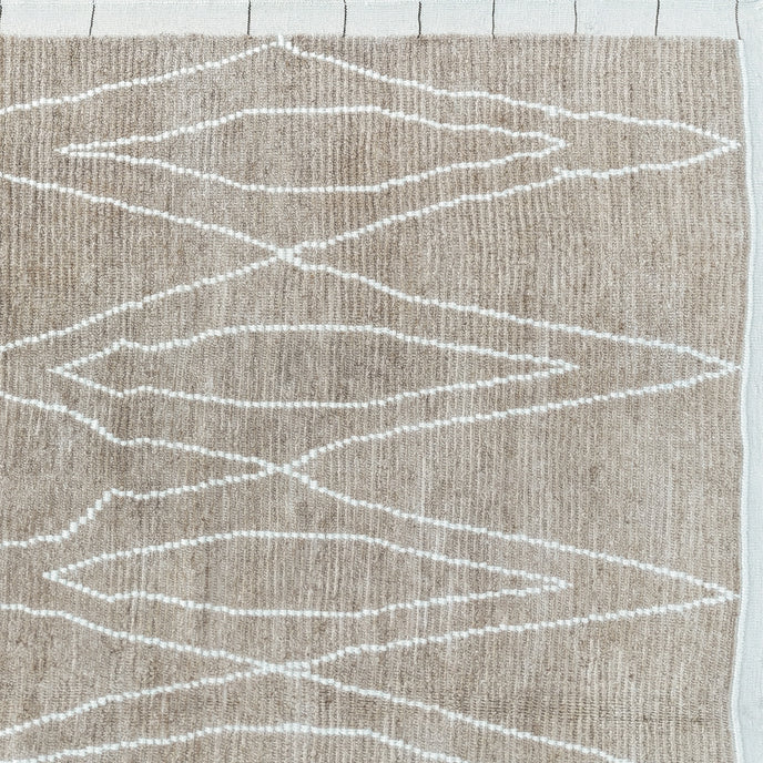 This new Turkish handwoven rug has a beautiful tan background with off white accents. We call this design the "modern tulu" which describes the new take on the classic tulu rug with a thicker pile.