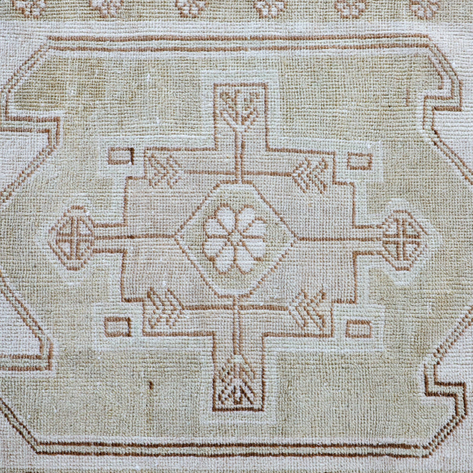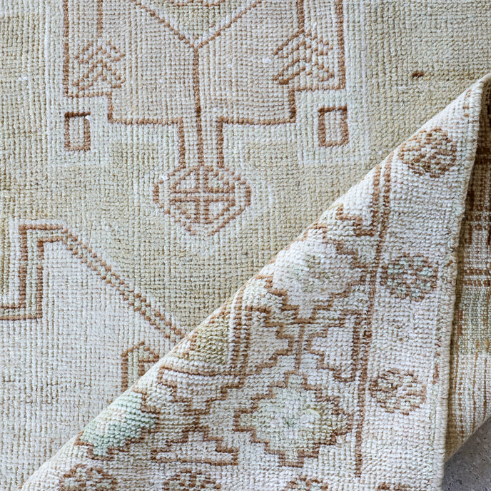 This vintage Turkish handwoven rug has a beautiful neutral background with green, tan, and neutral accents.