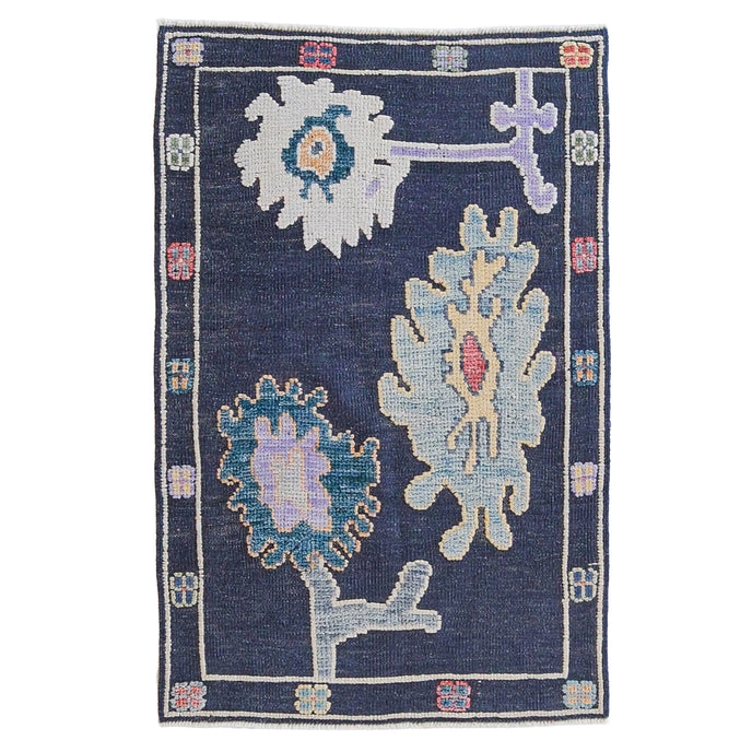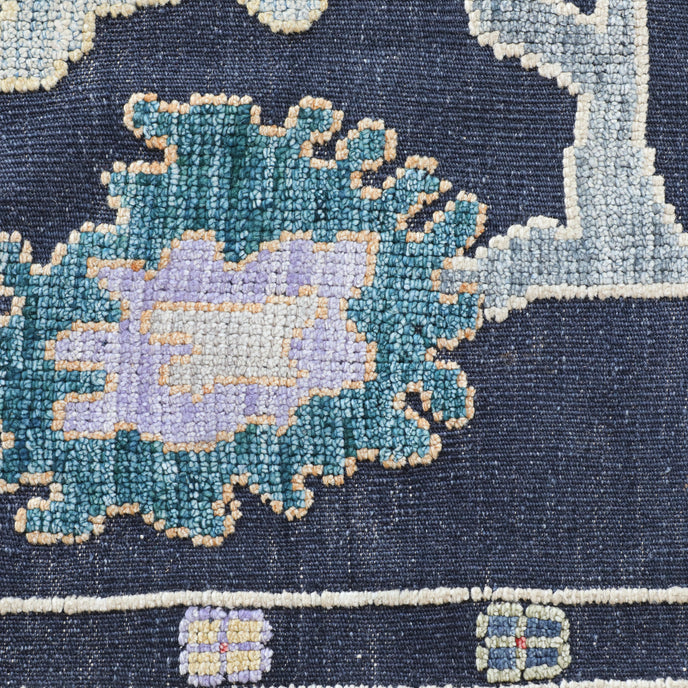 This new Turkish handwoven rug has a beautiful blue background with multicolored accents. We call this design the "high-low oushak" which describes the combination of low and high pile in the design.