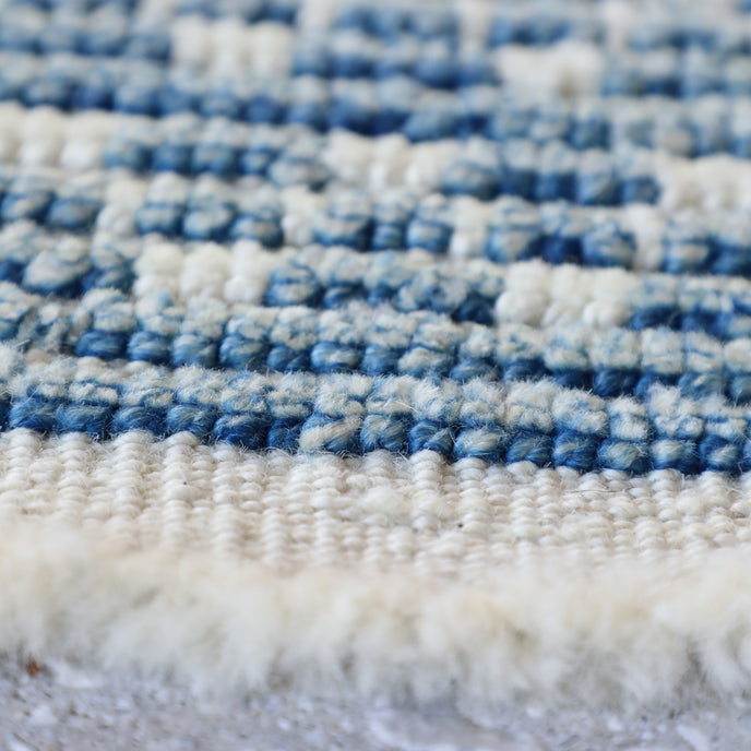 This new Turkish handwoven rug has a beautiful blue background with neutral accents. We call this design the "modern tulu" which describes the new take on the classic tulu rug with a thicker pile.