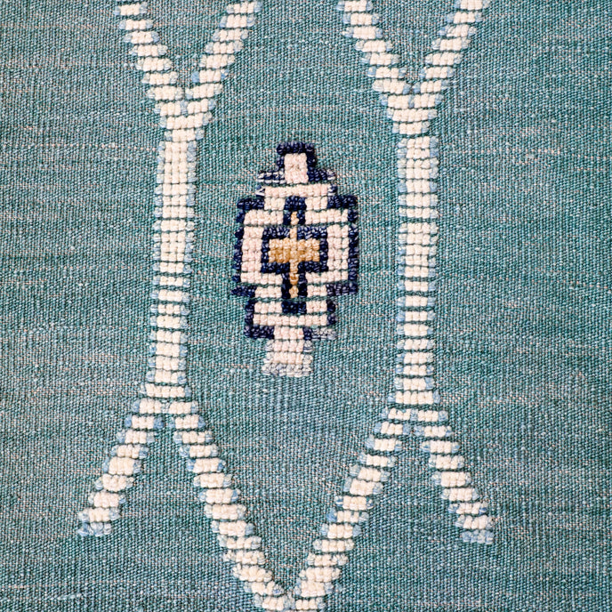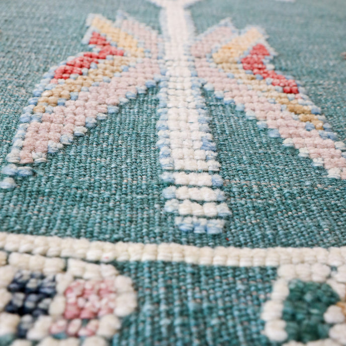 This new Turkish handwoven rug has a beautiful teal background with pink, navy, gold, blue, rust, and neutral accents. We call this design the "high-low oushak" which describes the combination of low and high pile in the design.