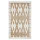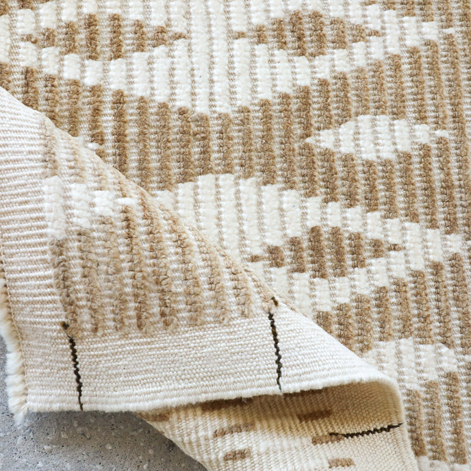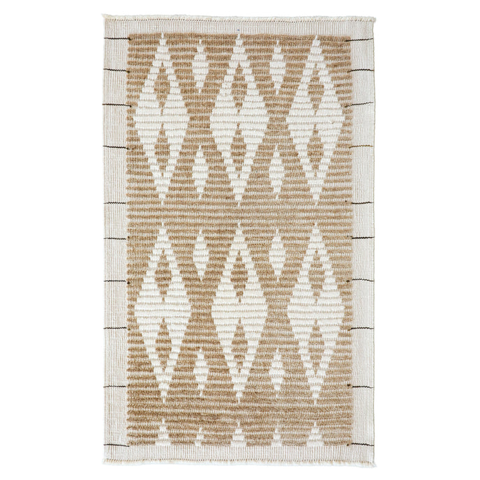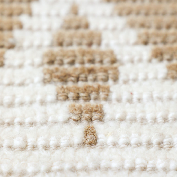 This new Turkish handwoven rug has a beautiful tan background with off white accents. We call this design the "modern tulu" which describes the new take on the classic tulu rug with a thicker pile.