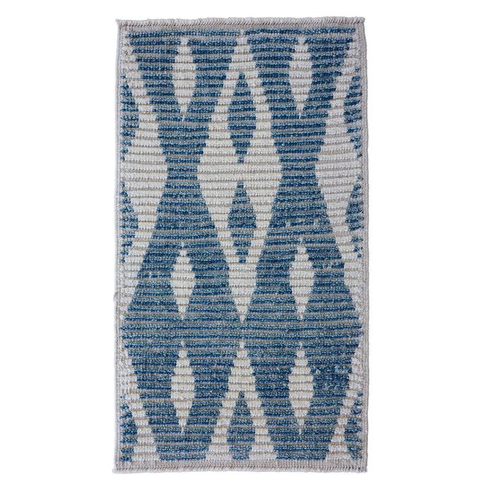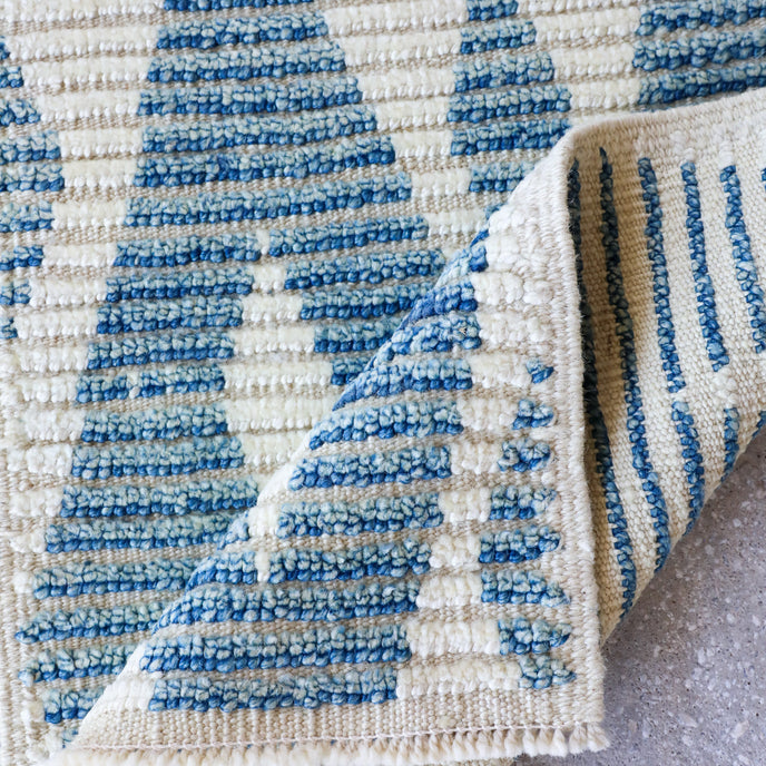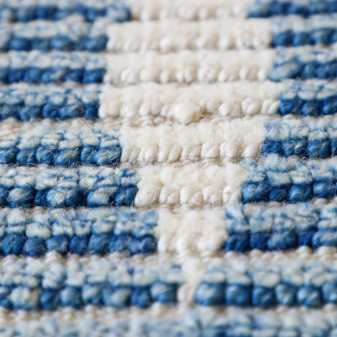 This new Turkish handwoven rug has a beautiful blue background with off white accents. We call this design the "modern tulu" which describes the new take on the classic tulu rug with a thicker pile.