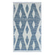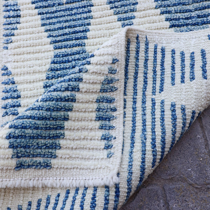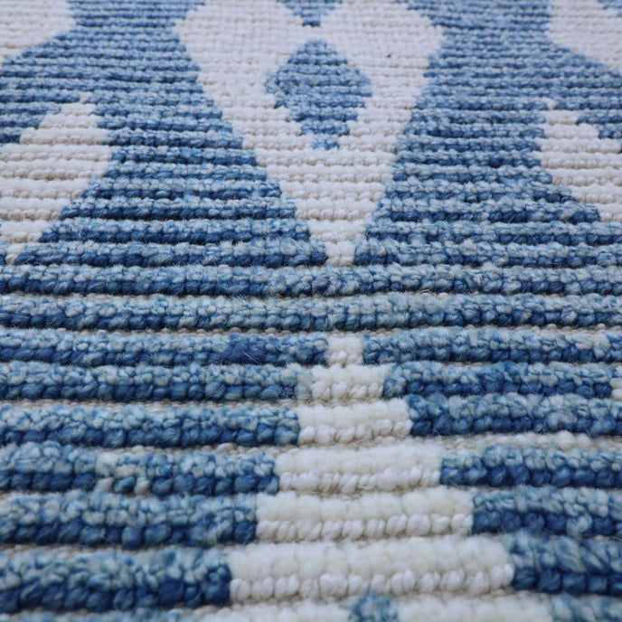 This new Turkish handwoven rug has a beautiful blue background with off white accents. We call this design the "modern tulu" which describes the new take on the classic tulu rug with a thicker pile.
