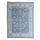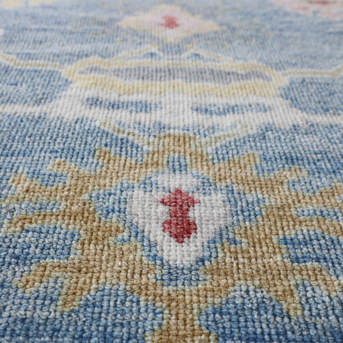 This new Turkish handwoven rug has a beautiful blue background with multicolored and neutral accents. We call this design the "modern oushak" which describes the new take on the classic oushak rug.