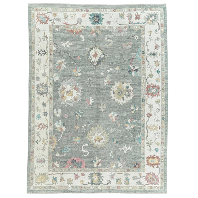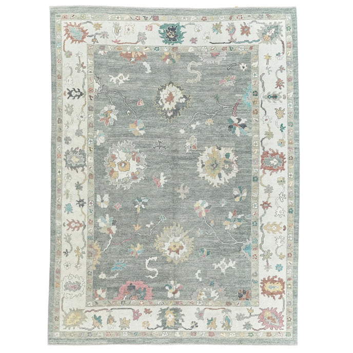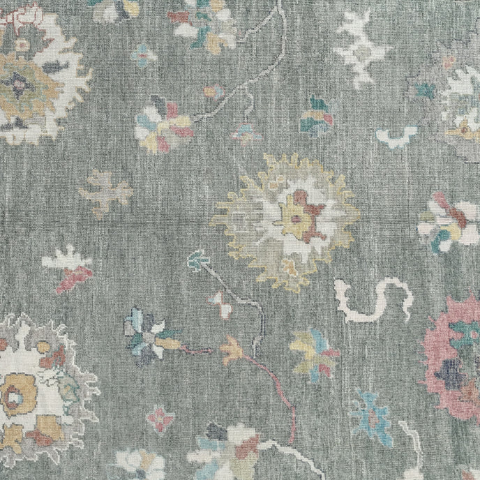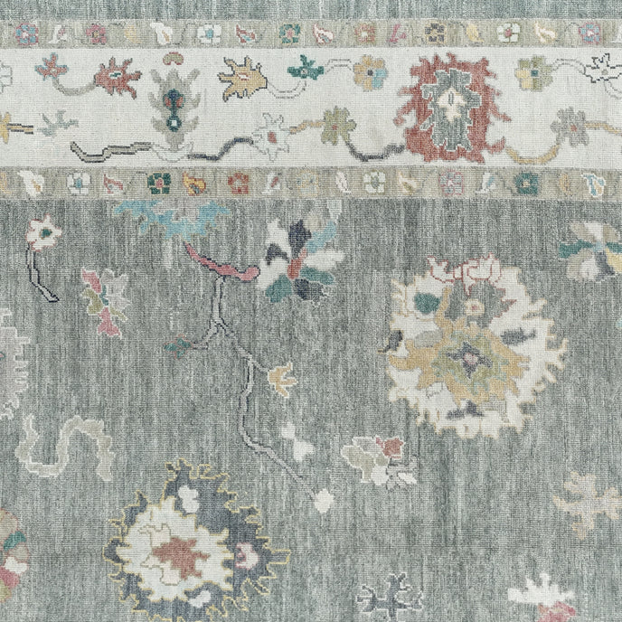This new Turkish handwoven rug has a beautiful greenish gray background with multicolored accents. We call this design the "modern oushak" which describes the new take on the classic oushak rug.