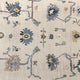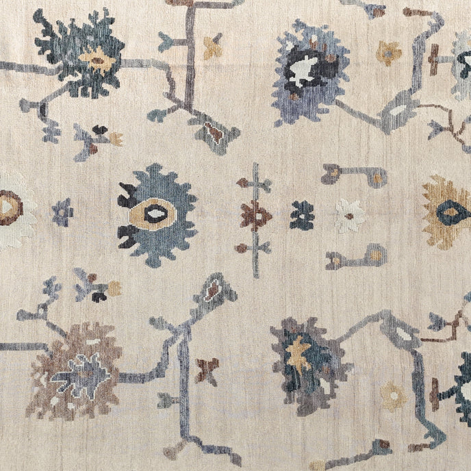 This new Turkish handwoven rug has a beautiful neutral background with blue, brown, gold, gray, and neutral accents. We call this design the "high-low oushak" which describes the combination of low and high pile in the design.