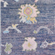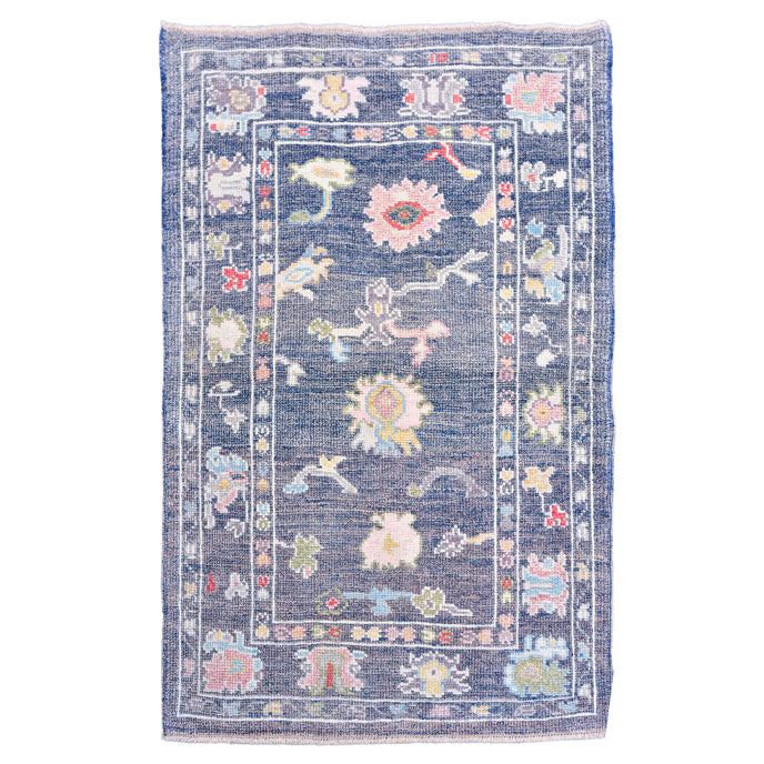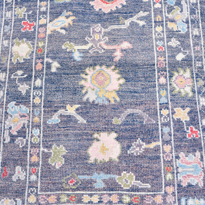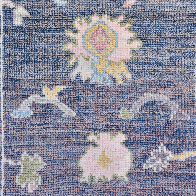 This new Turkish handwoven rug has a beautiful blue background with pink, green, yellow, and neutral accents. We call this design the "modern oushak" which describes the new take on the classic oushak rug.