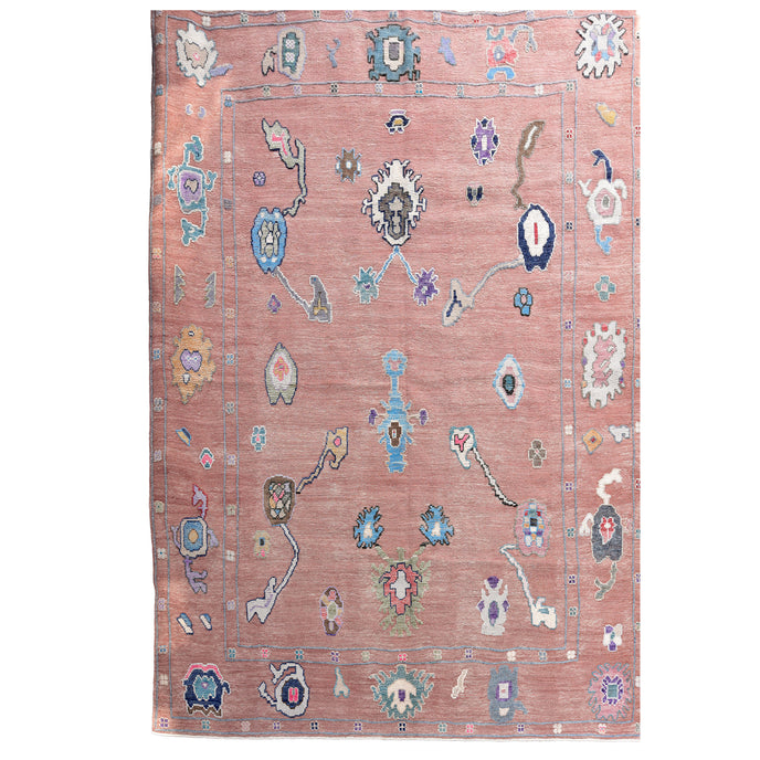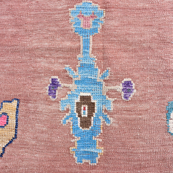 This new Turkish handwoven rug has a beautiful salmon background with multicolored and neutral accents. We call this design the "high-low oushak" which describes the combination of low and high pile in the design.