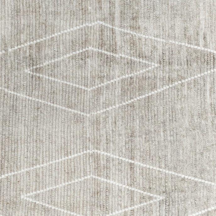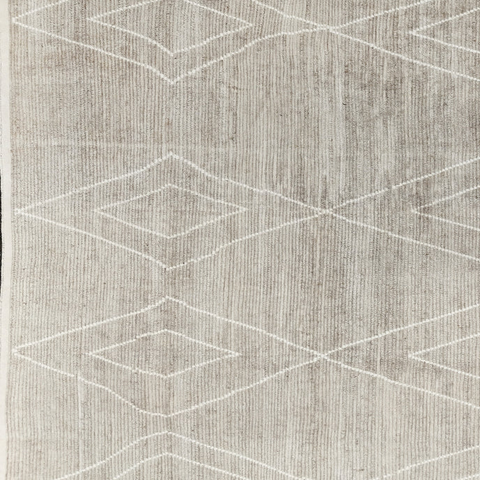 This new Turkish handwoven rug has a beautiful tan background with off white accents. We call this design the "modern tulu" which describes the new take on the classic tulu rug with a thicker pile.