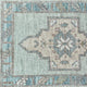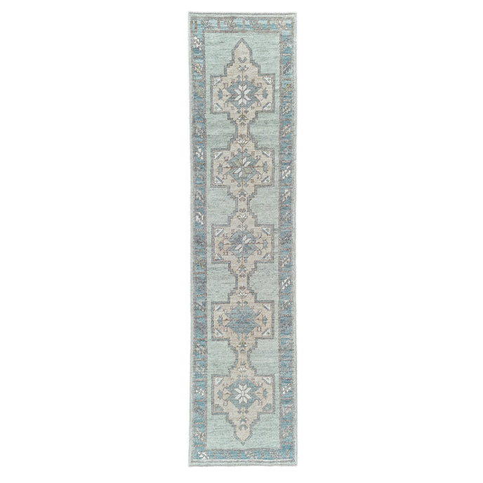 This new Turkish handwoven rug has a beautiful grayish green background with beige and blue accents. We call this design the "modern oushak" which describes the new take on the classic oushak rug.