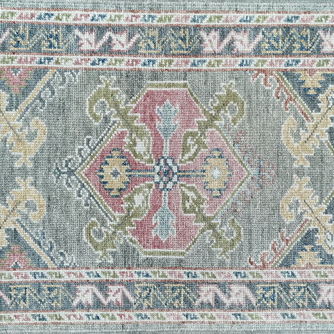 This new Turkish handwoven rug has a beautiful green background with multicolored accents. We call this design the "modern oushak" which describes the new take on the classic oushak rug.