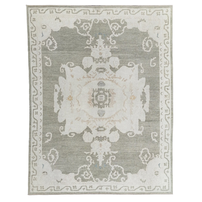 This new Turkish handwoven rug has a beautiful soft green background with tan and neutral accents. We call this design the "modern oushak" which describes the new take on the classic oushak rug.
