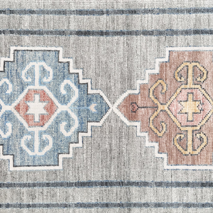 This new Turkish handwoven rug has a beautiful gray background with blue, gold, salmon, pink,and neutral accents. We call this design the "modern oushak" which describes the new take on the classic oushak rug.