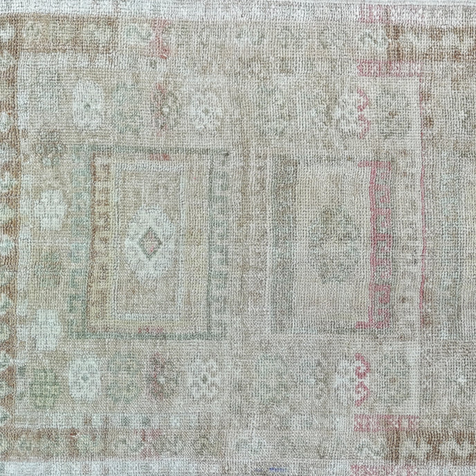 This vintage Turkish handwoven rug has a beautiful neutral background with rust and green accents.