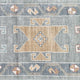 This new Turkish handwoven rug has a beautiful gray background with blue, gold, salmon, brown, and neutral accents. We call this design the "modern oushak" which describes the new take on the classic oushak rug.