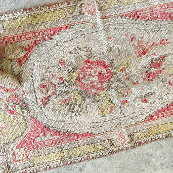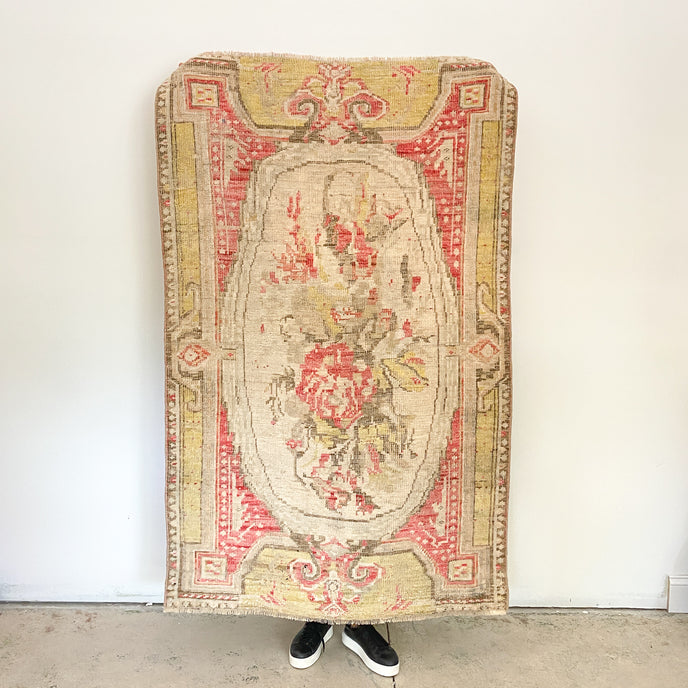 This Turkish handwoven vintage rug has a gorgeous off white background with yellow, salmon pink, and neutral accents. Gordes.