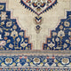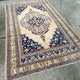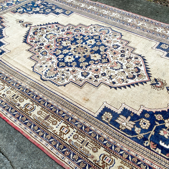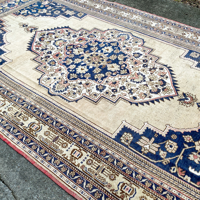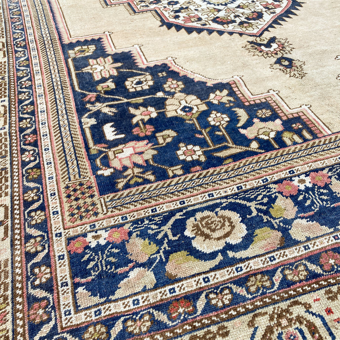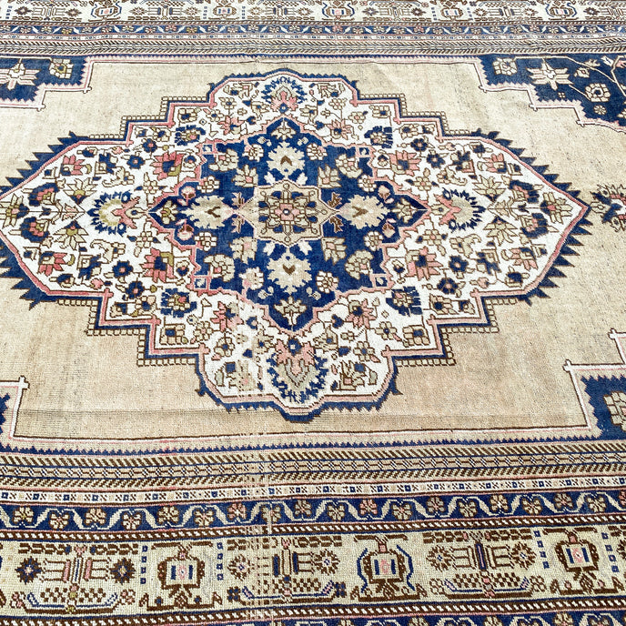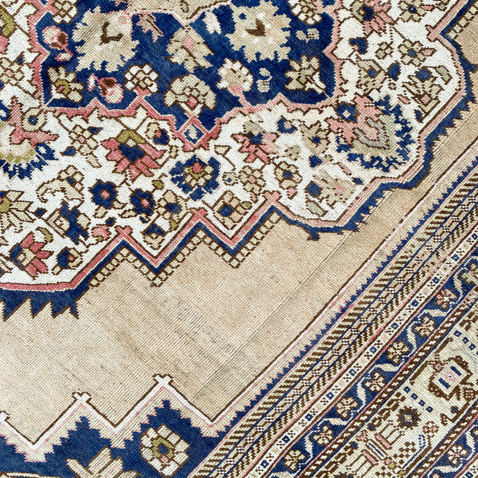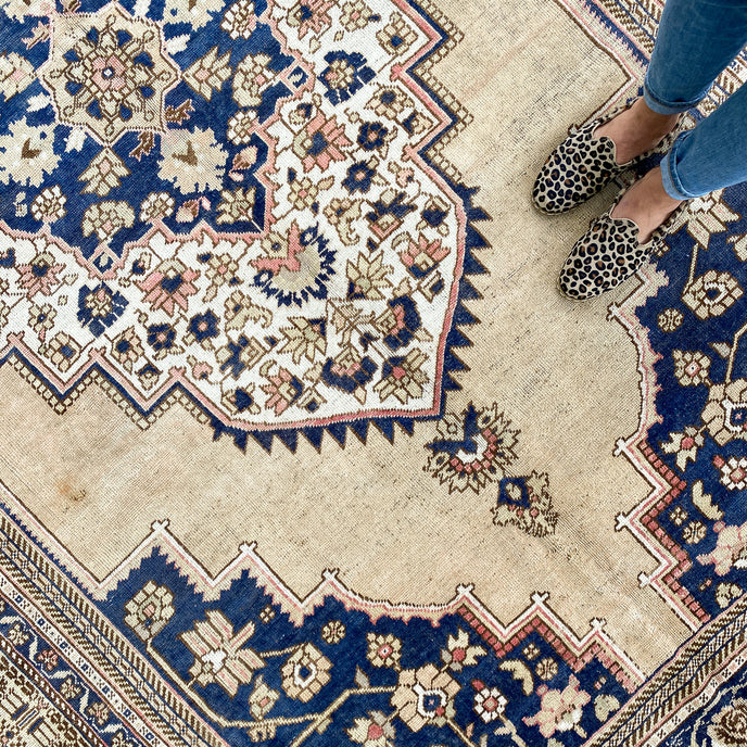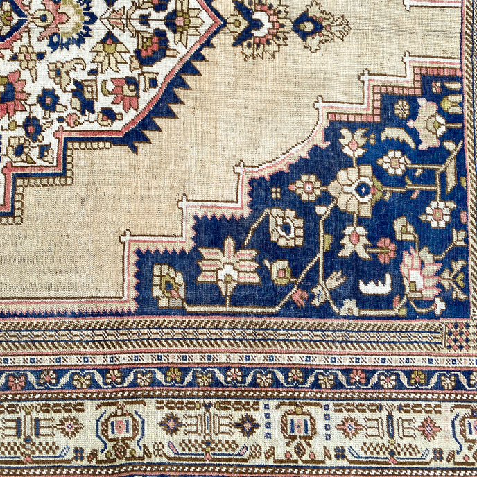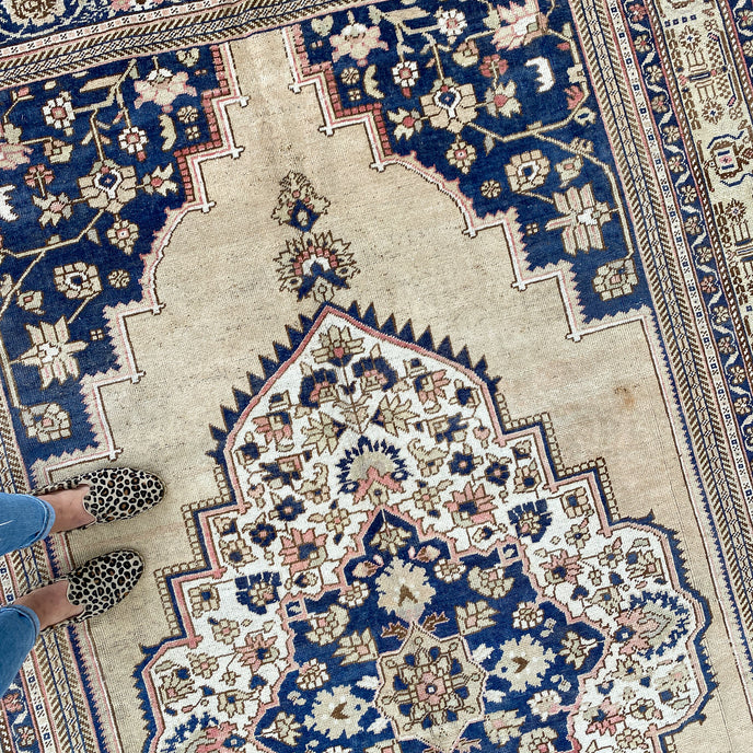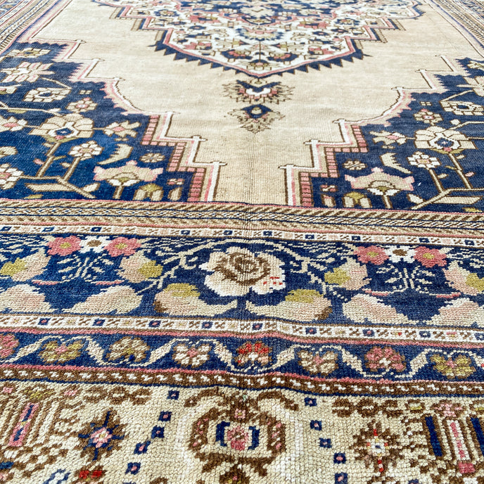 This Turkish handwoven vintage rug has a gorgeous golden neutral background with pink, green, navy, salmon, and brown accents. Taşpınar.