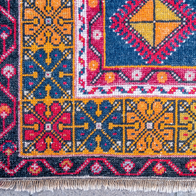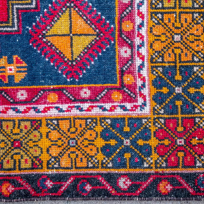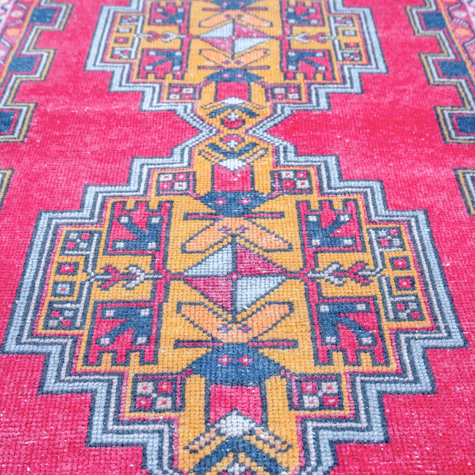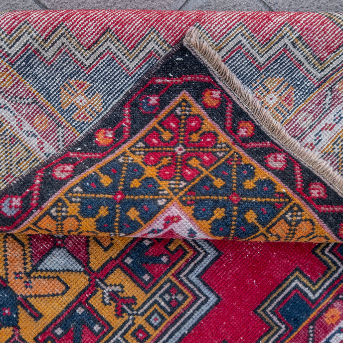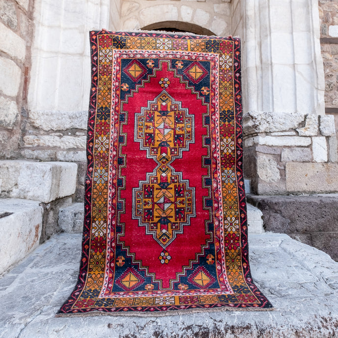 This Turkish handwoven vintage rug has a beautiful red background with yellow, blue, and white accents. Niğde.