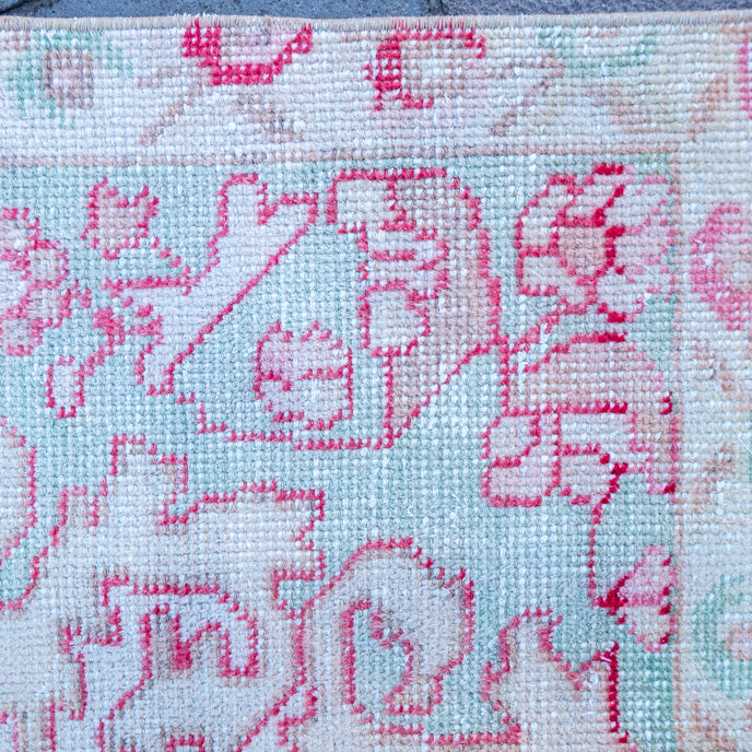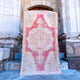 This Turkish handwoven vintage rug has a beautiful pink background with blue and neutral accents. Avonoz.